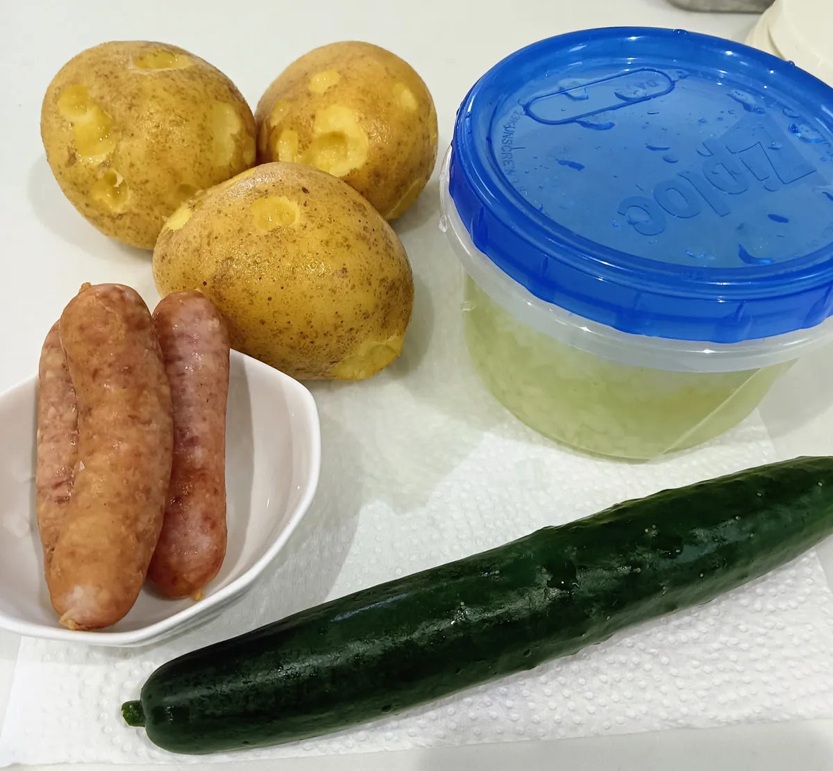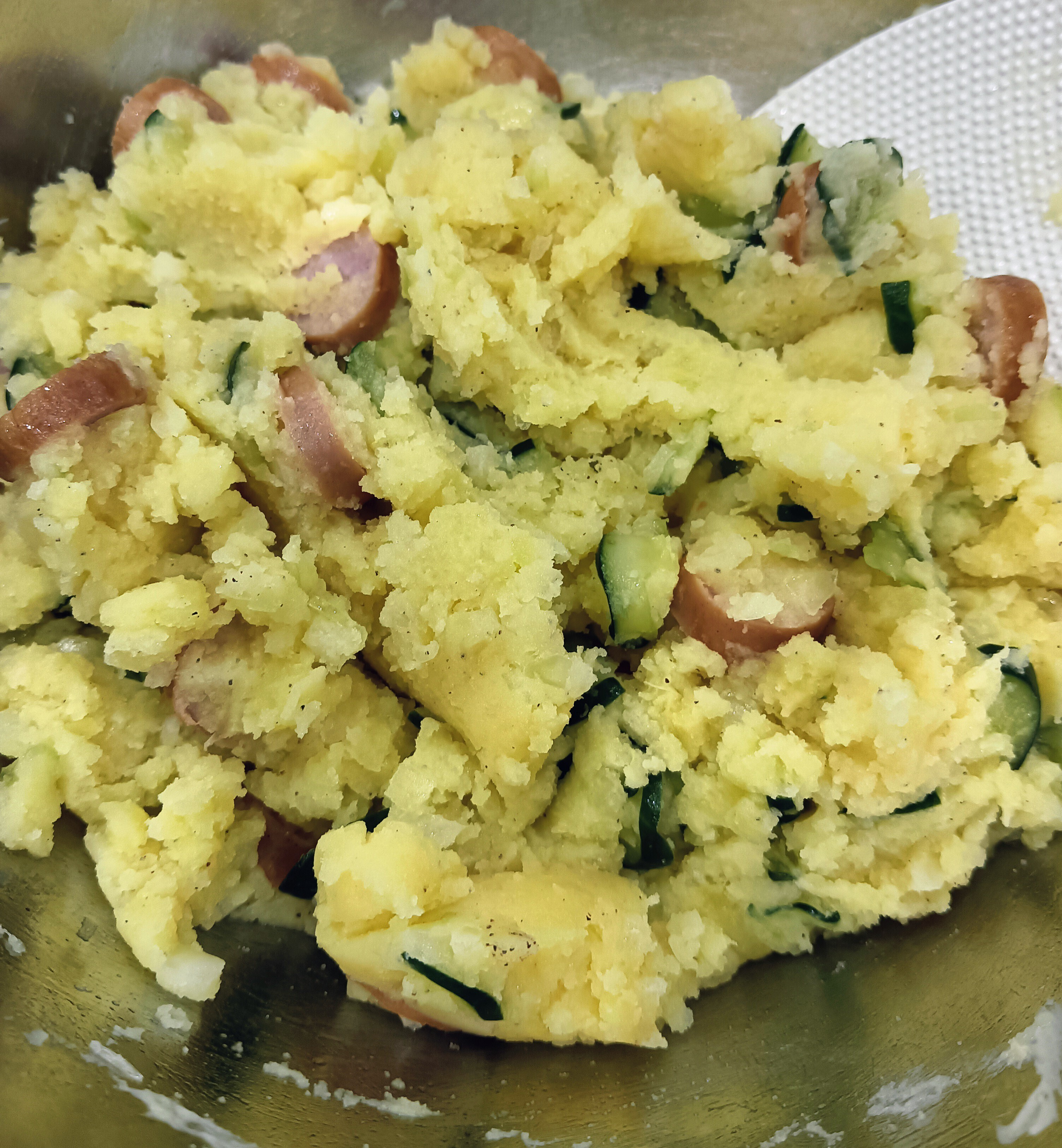 ■材料 じゃが芋(芽取りして洗った物)450g、🧅みじん切り2分の1個分(水に晒しておく)、ウインナー3本(茹でて小口切りキッチンペーパーで絞る)、胡瓜4分の3本(塩もみして絞る)