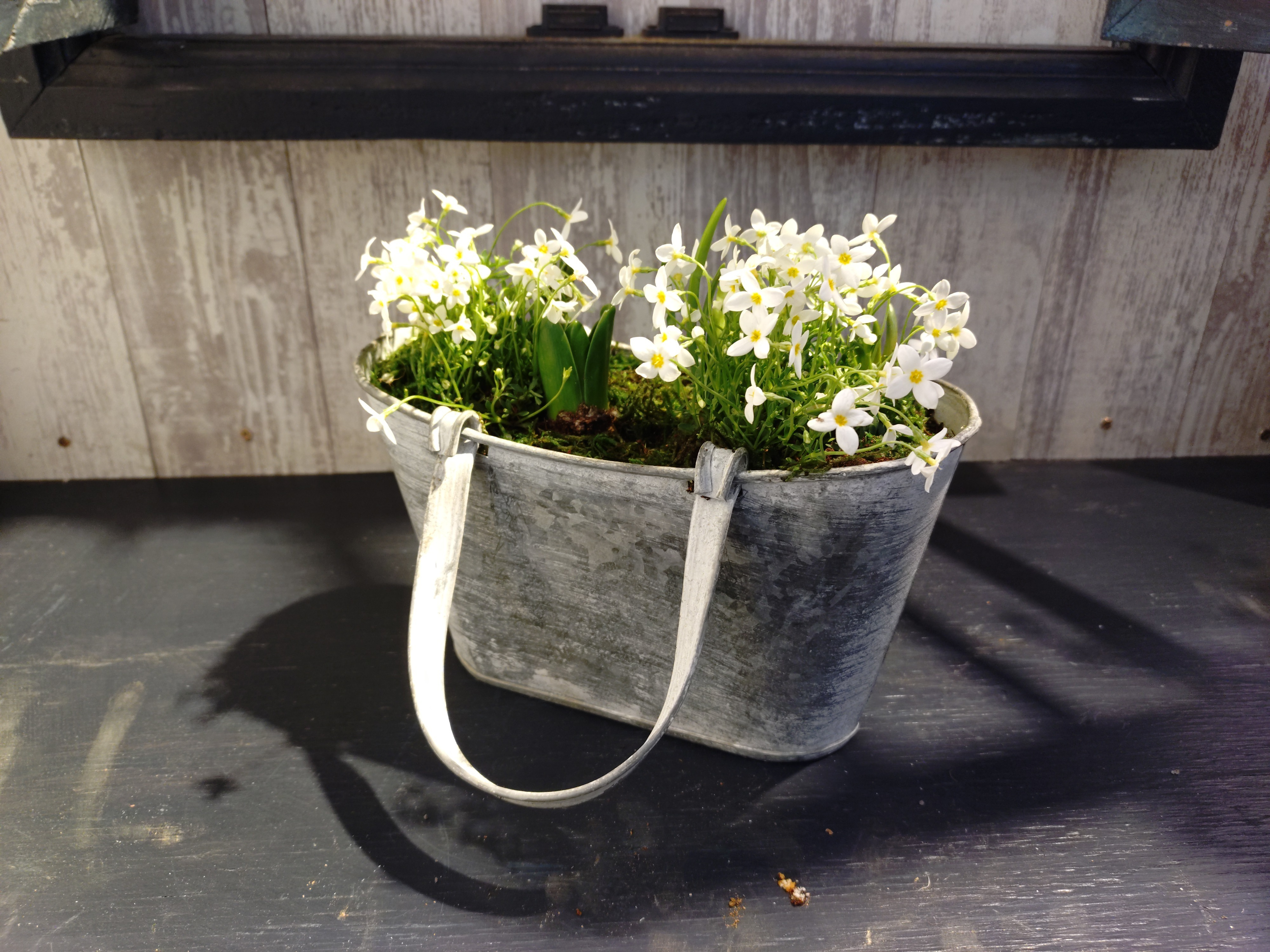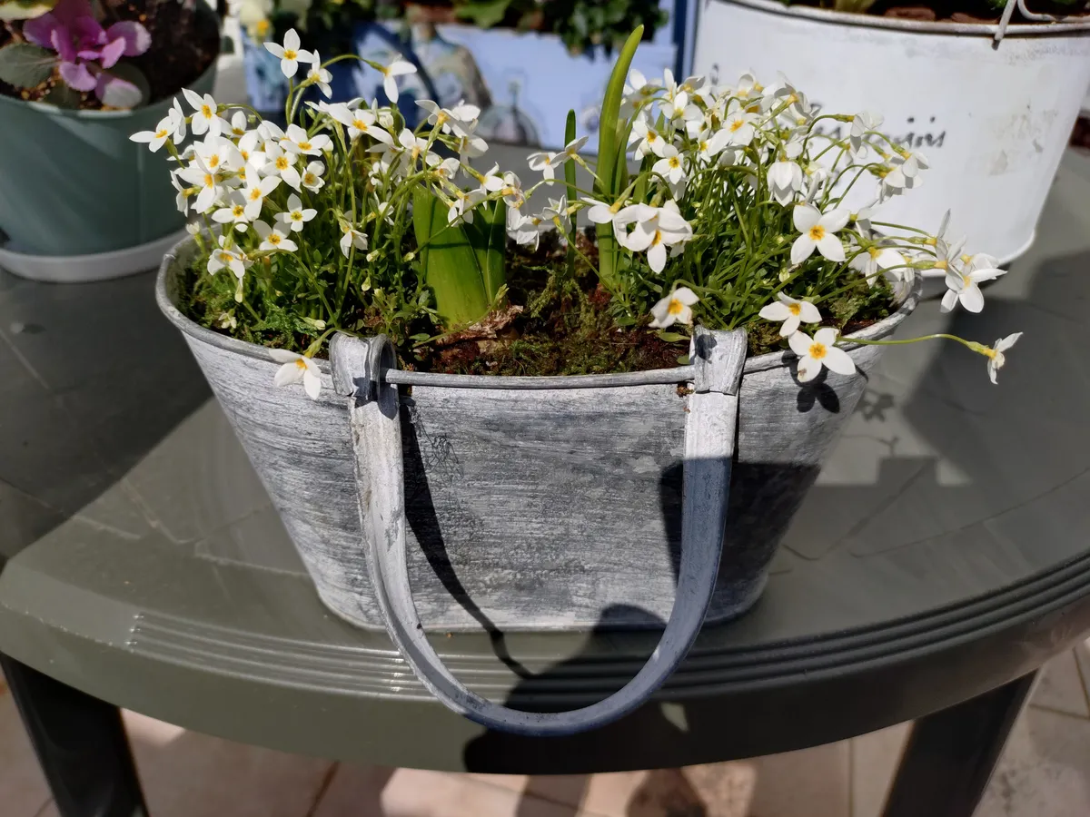 トップ > ワークショップ > その他 > 芽出し球根のアンティーク寄せ植え りかちゃん 2026/02/22 15:31 芽出し球根のアンティーク寄せ植え 白を基調とした寄せ植えにしたくて、ヒナソウとヒヤシンスを白にしました😊 ヒナソウの影になっていますが、ムスカリ×3と水仙を植えています 根本はグリーンのモスを使っているので、スッキリ仕上がりました👏 このブリキの鉢がすごく好き😄 取っ手は動くので、置いても引っ掛けても使えます👍️ これからモリモリになるみたい🎵 りかちゃんGWS カインズ鶴ヶ島店 いいね 共有する 共有する X LINE リンクをコピー コメントする 0 件の返信 (新着順)