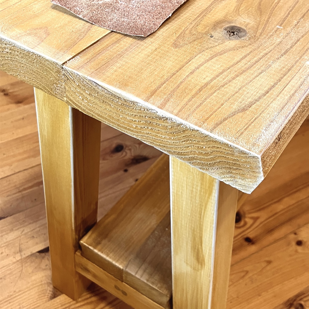 持ち帰ったあと、せっかくならオールドパインの雰囲気を出してみたいと思い、角を60番の紙やすりで削りました。