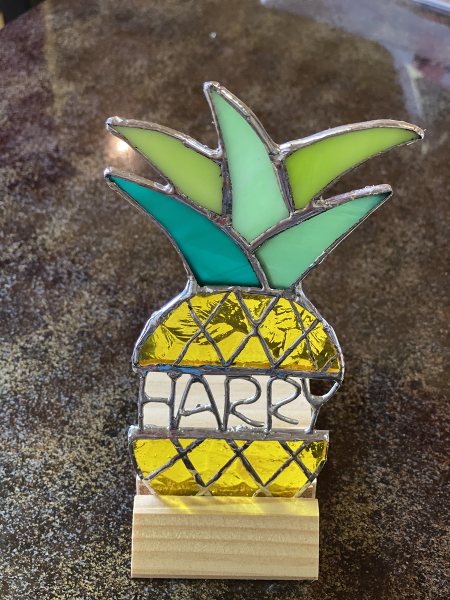 投稿を表示とっても可愛いパイナップルのステンドグラスですね。🍍HARRYの文字を作るなんて‼️凄いですね。私も体験でステンドグラスやった事がありますが、ハンダ付けがなかなか難しくて。文字を作るなんてとても出来ません。明るい日差しの入る所に置くと、綺麗でしょうね🤗