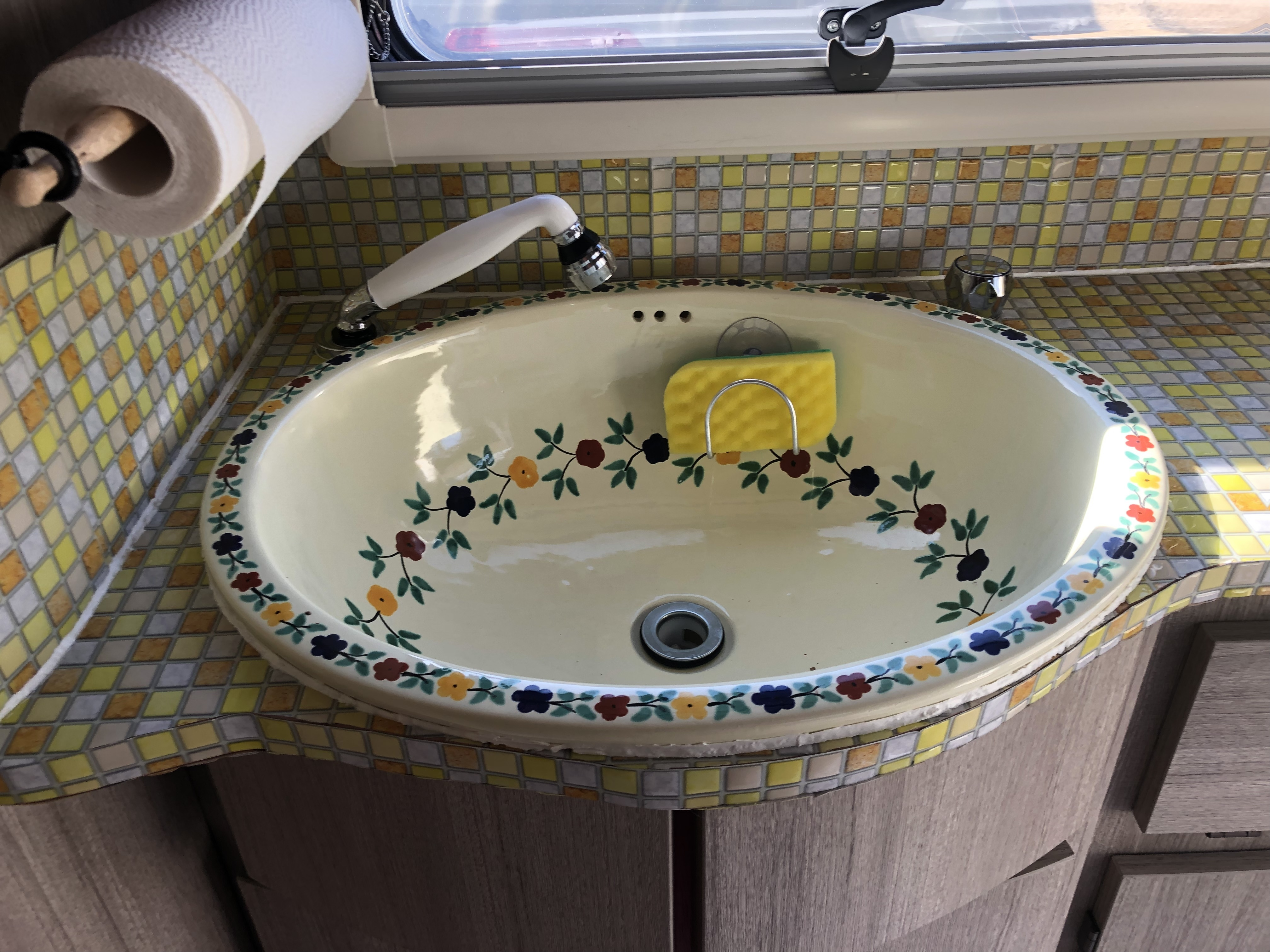 キャンピングカーのシンクをメキシコ製の陶器シンクに交換、更に天板や壁にタイル模様の壁紙を貼り付けました
