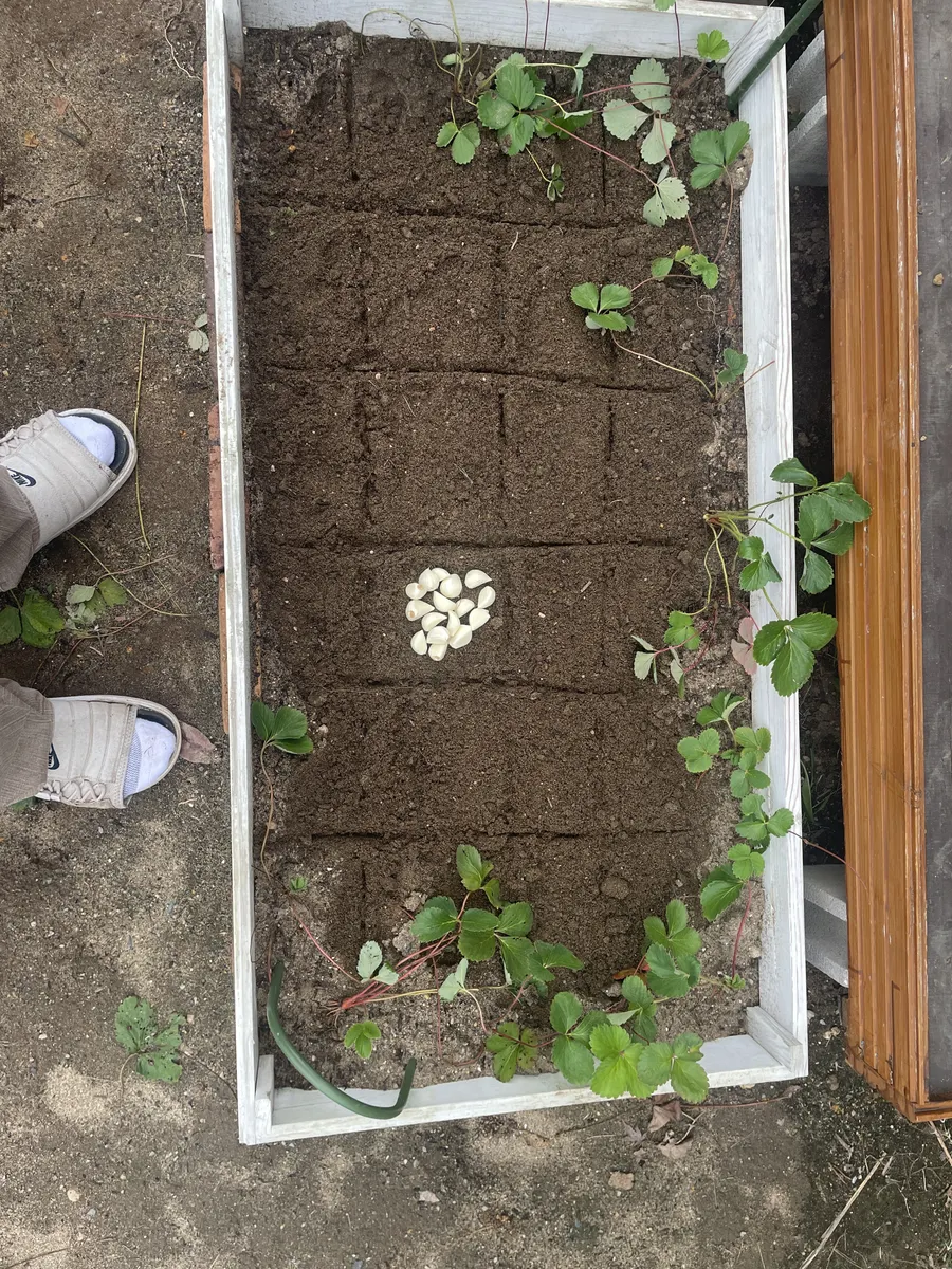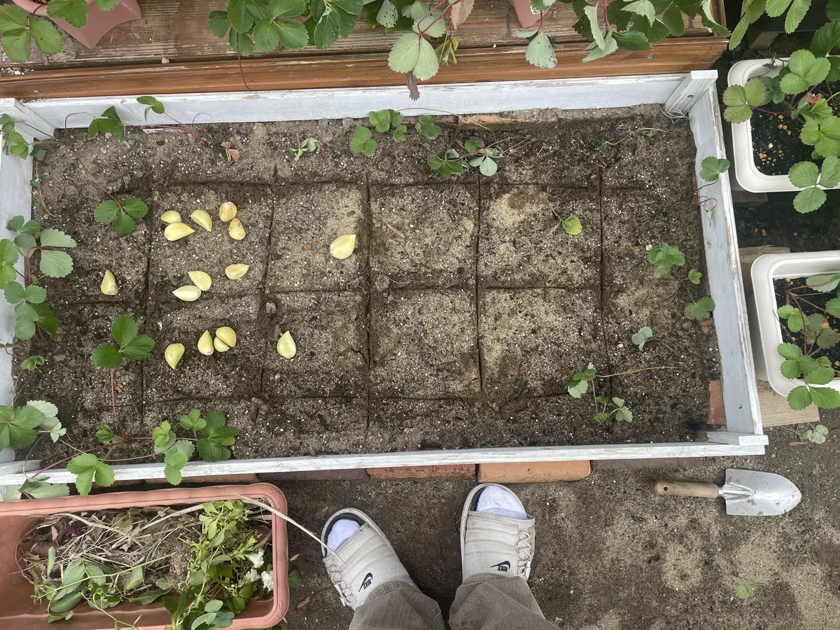 ジャンボニンニクと昨年植えたホワイト6片です。