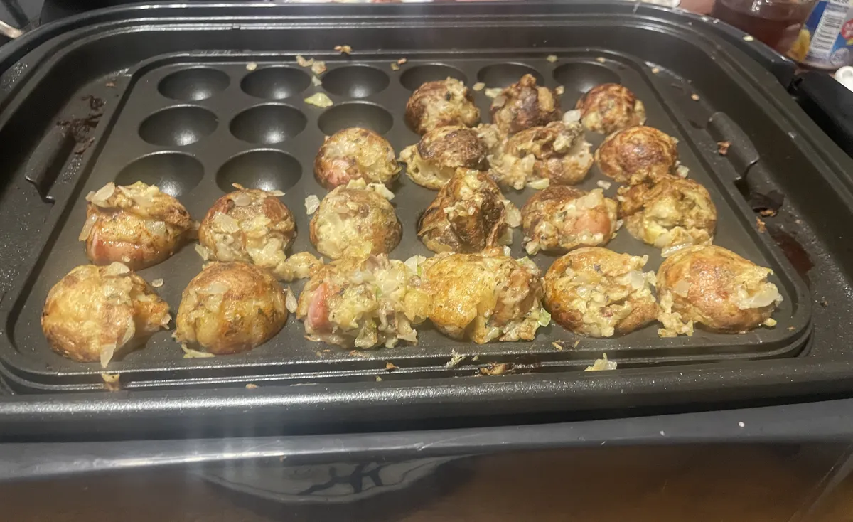 先に作ったたこ焼きベースに材料①の玉葱荒微塵切りと調味料①のバジル加えてから鉄板に流し入れ、まんまと旦那氏言いくるめてスーパーでオカンが指定したソーセージGETして来たのと、調味料②の蕩けるチーズ散らしたらLET’Sくるくるぅ〜🤣🙌🧅🌭🏒➰🌀⬛️🕳️🔥‼️💨✨