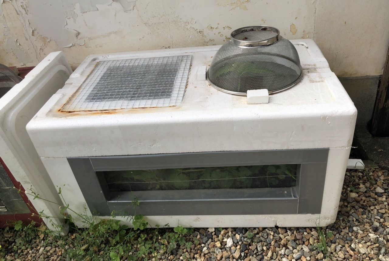 トロ箱を改造したスズムシの飼育箱です。数年前に作って外に置きっぱなので、ちょっと汚いです。すみません💦
