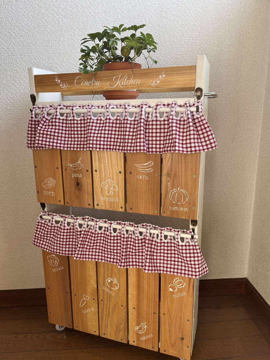 自宅に帰って野菜のステンシルをしたりワゴンにホコリが入るのが気になったのでカフェカーテンをサイズに合わせて切ってミシンで縫いました✨