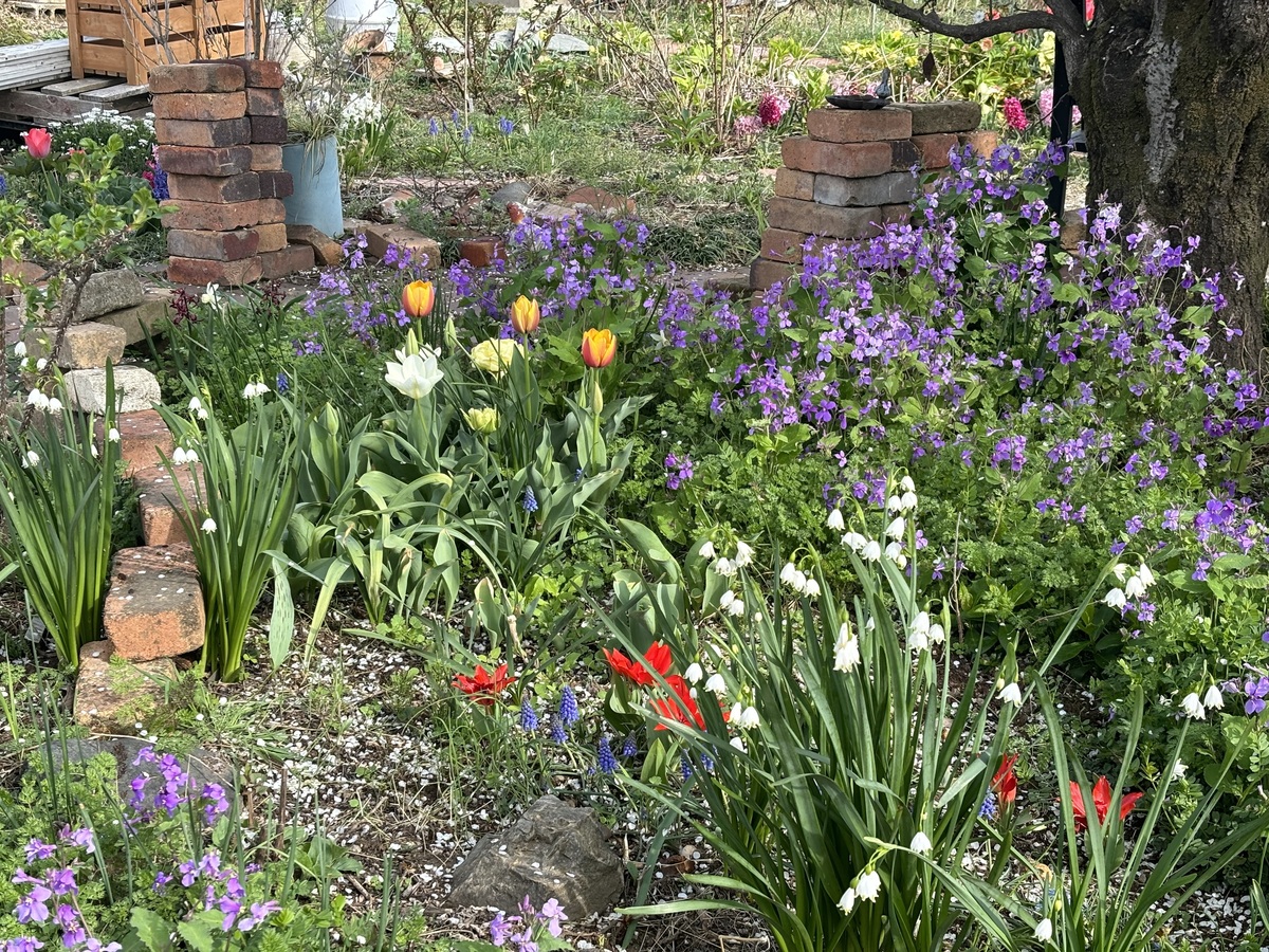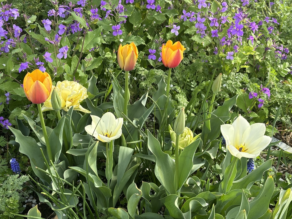 大きなすももの木🌲その下で,可愛い花たちがたくさん咲いて最高ですね。癒しのお庭ですね💓