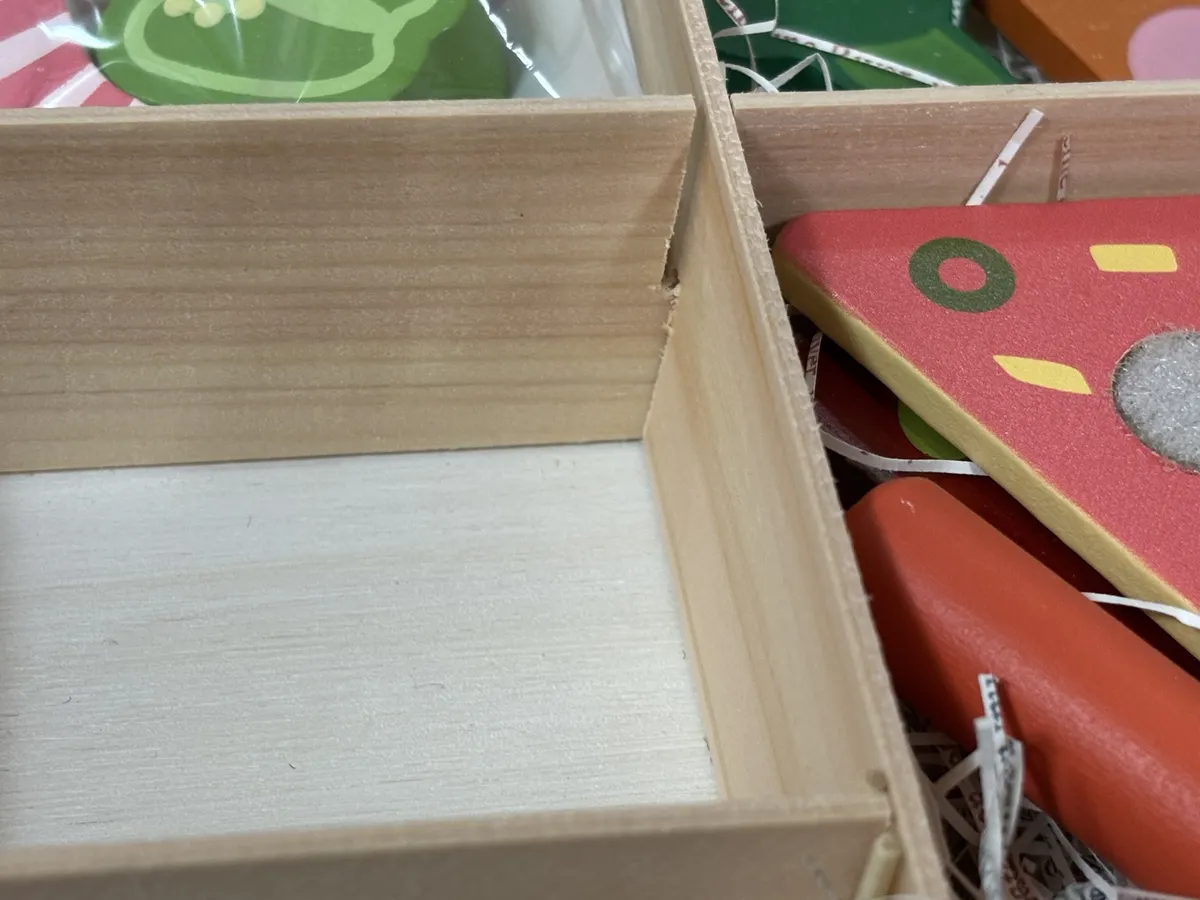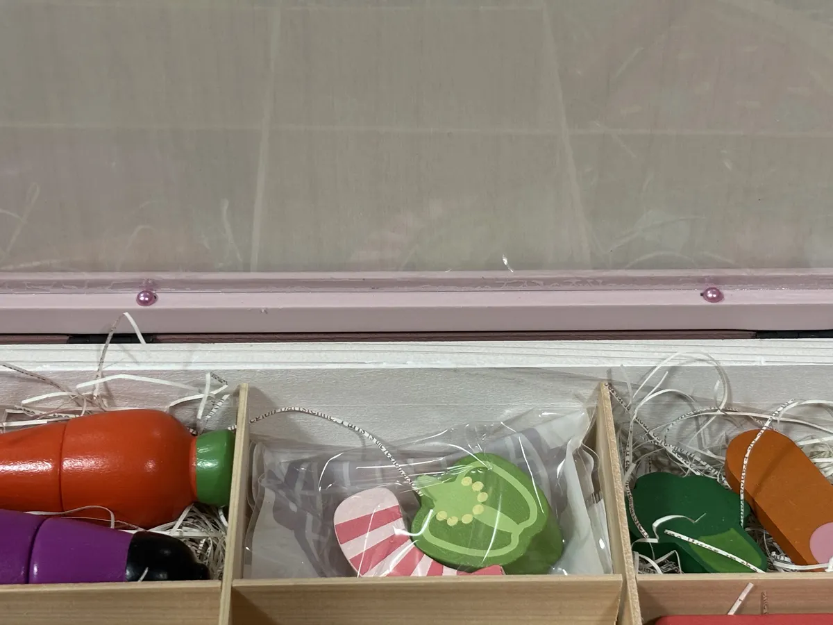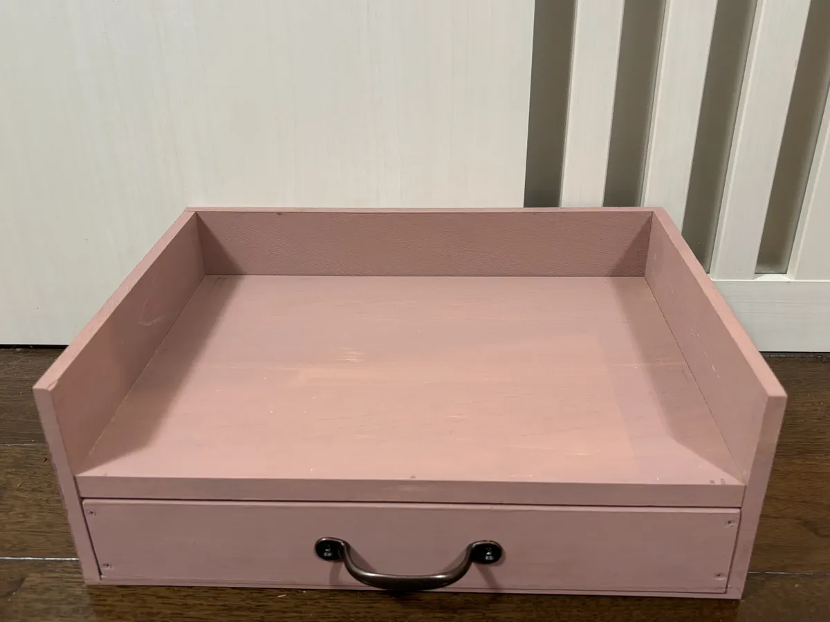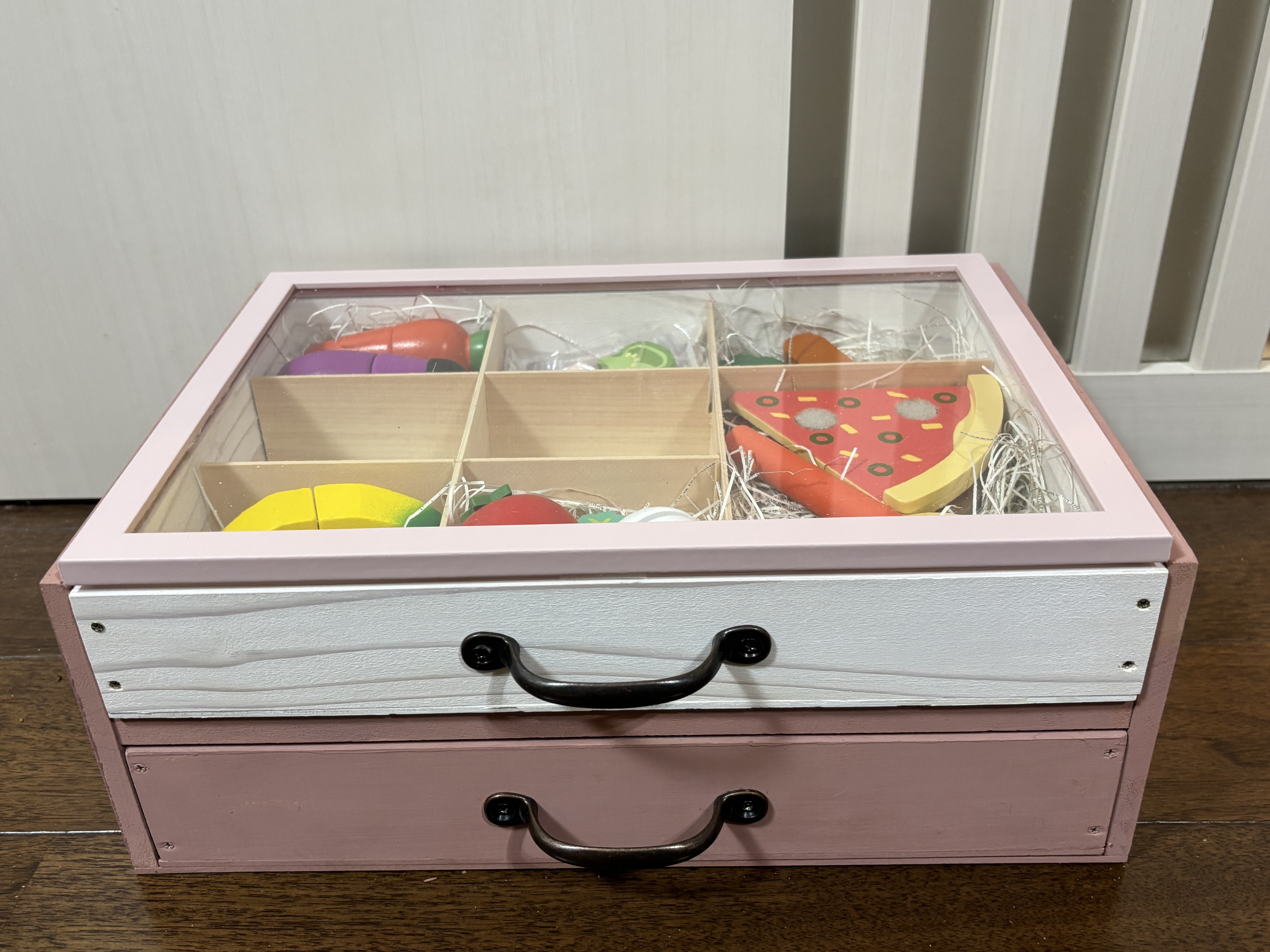 ピンク色が好きと聞いたのでアンティークカラーズのヴィンテージローズとソリッドカラーのホワイトで塗装しました。蓋部分は100均のフレームなので、押さえの部分の金具をグニグニして取り、怪我防止の為デコシールを貼りました。2歳なので蓋はマジックテープで閉まる様にしました。おままごとセットが増えても収納出来る様に、引き出しを作りました。