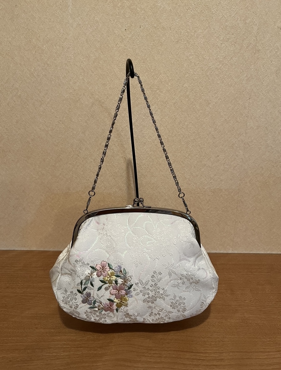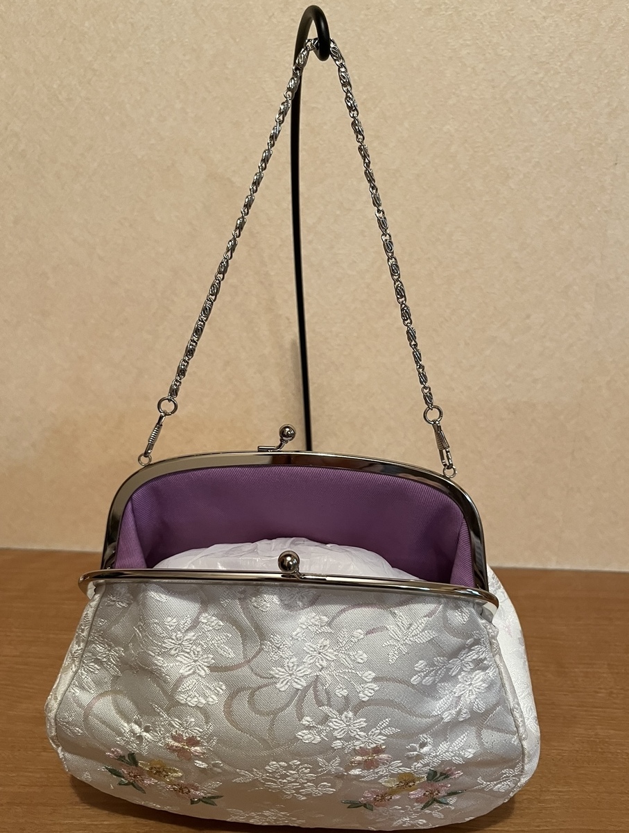 素敵な帯留め、髪飾りですね。バッグが最高に素敵。刺繍、綺麗、可愛いし、裏地の紫がいいですね。バッグは一生ものではないのでしょうか?