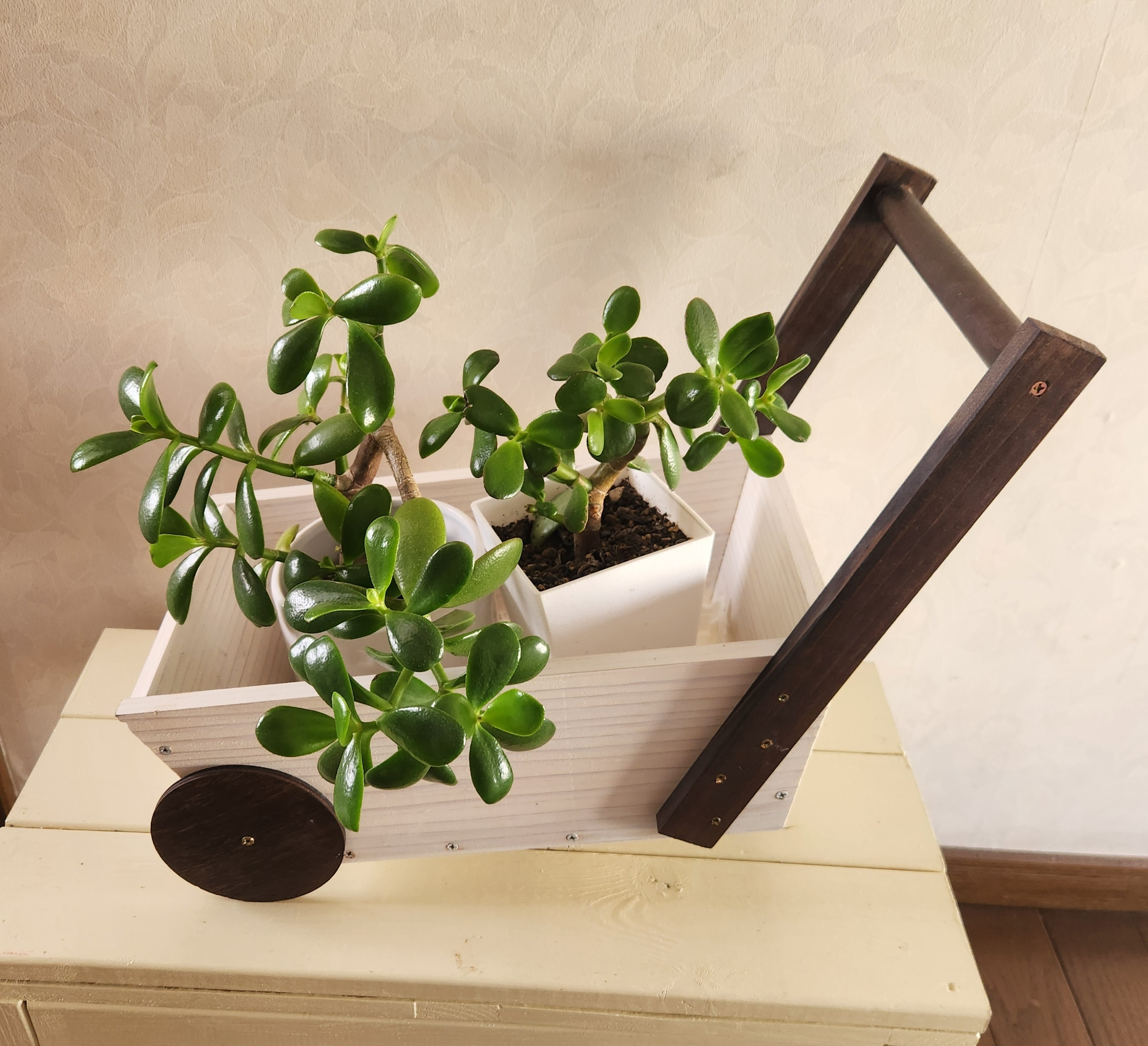 フラワーカートに今年植え替えした金のなる木を乗せました🎶