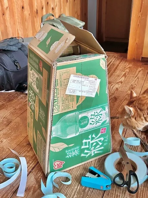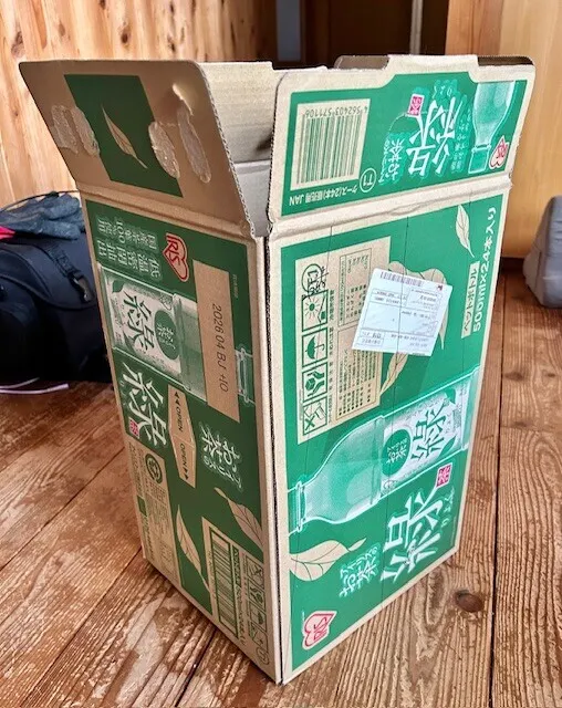 このお茶の箱を切ったり貼ったりして、台形の跳び箱様の物を作り