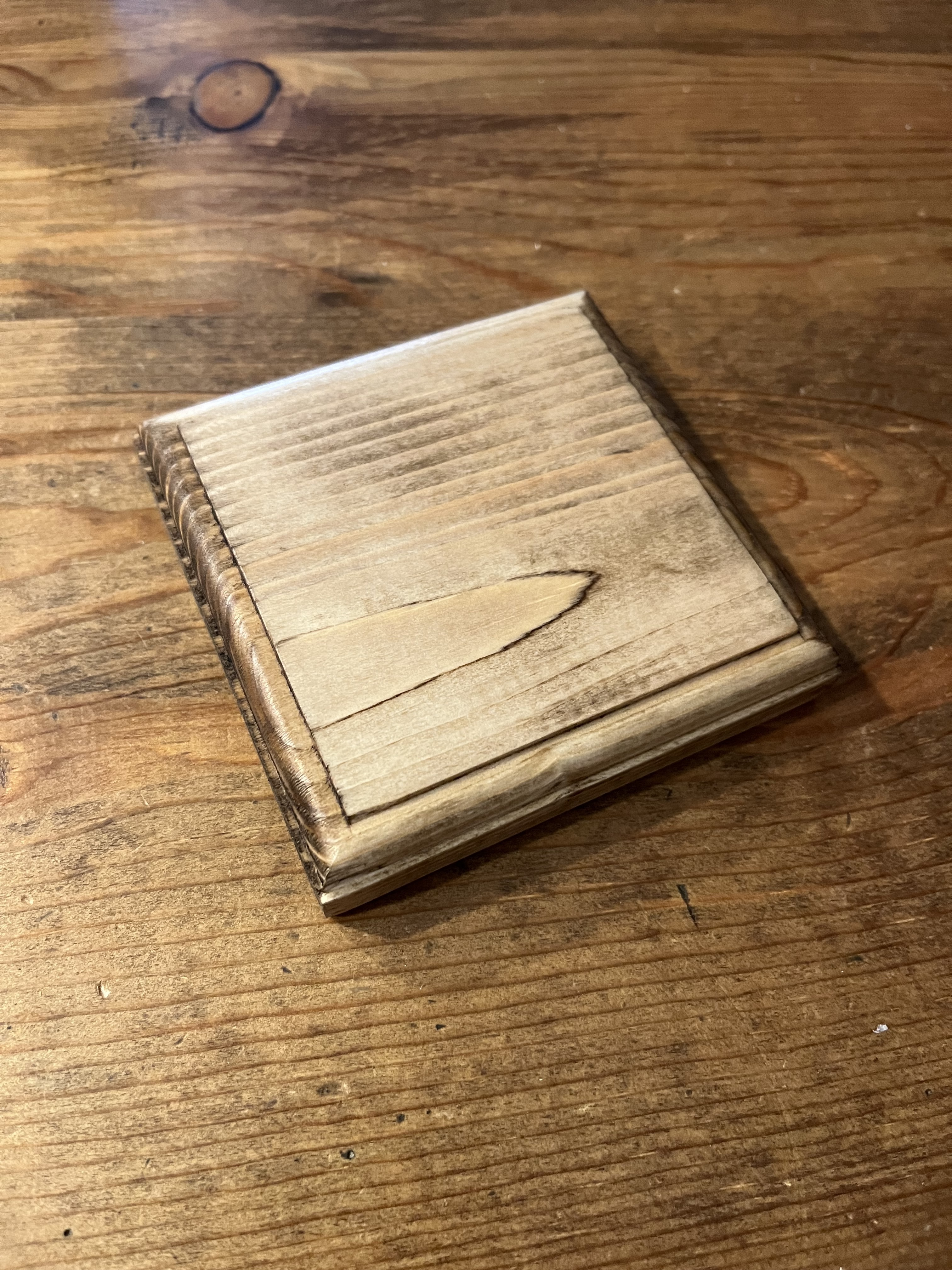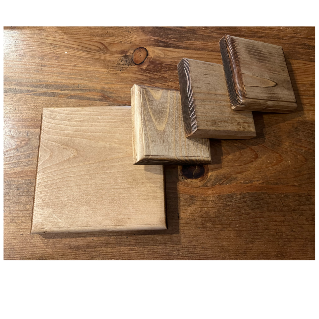 コースターも同じ理由で正方形にしました。トリマーで角を丸みと面取りとギンナンの3種類、まるで、トリマービットの削りサンプルのようになってしまいました😁