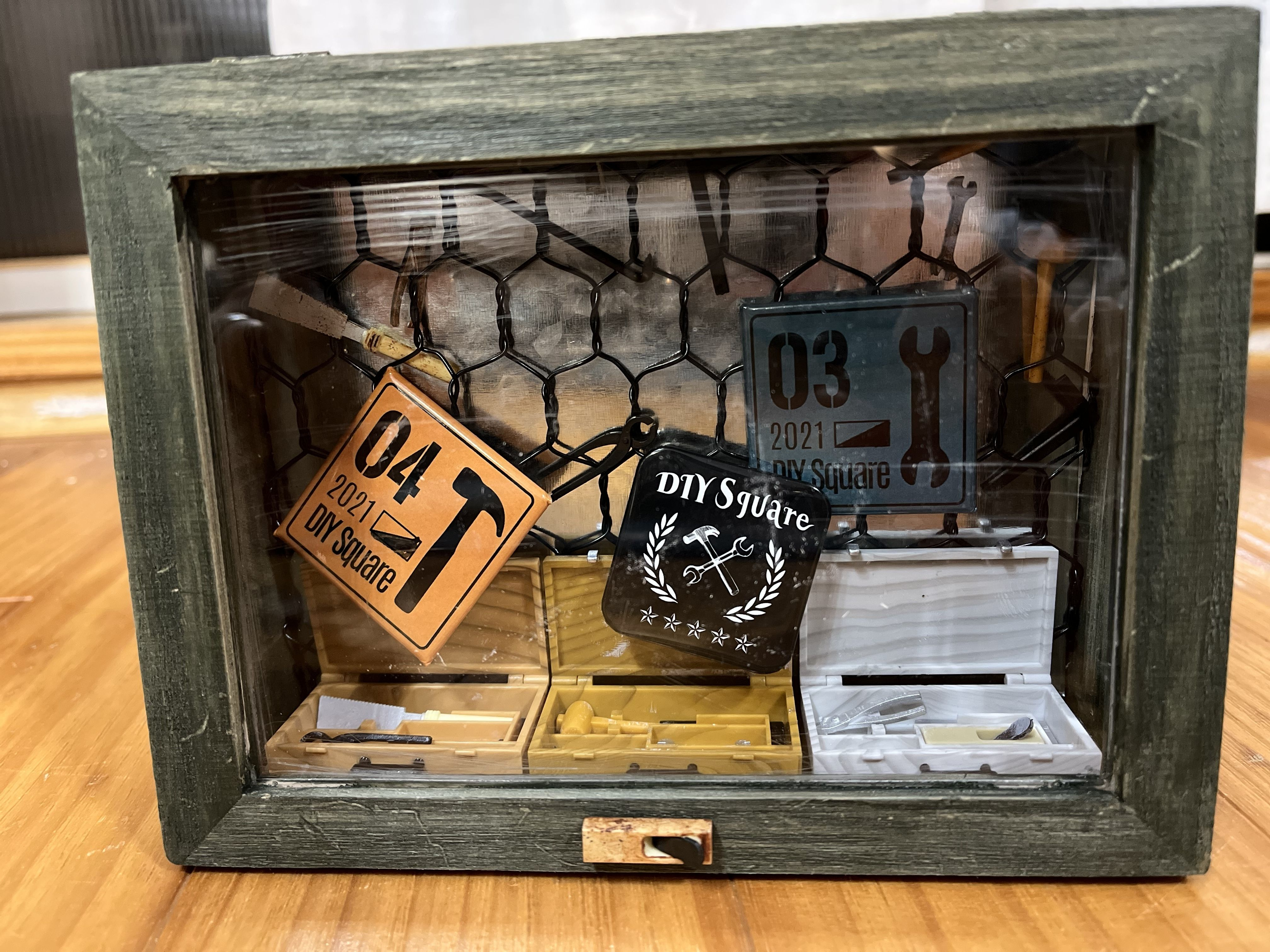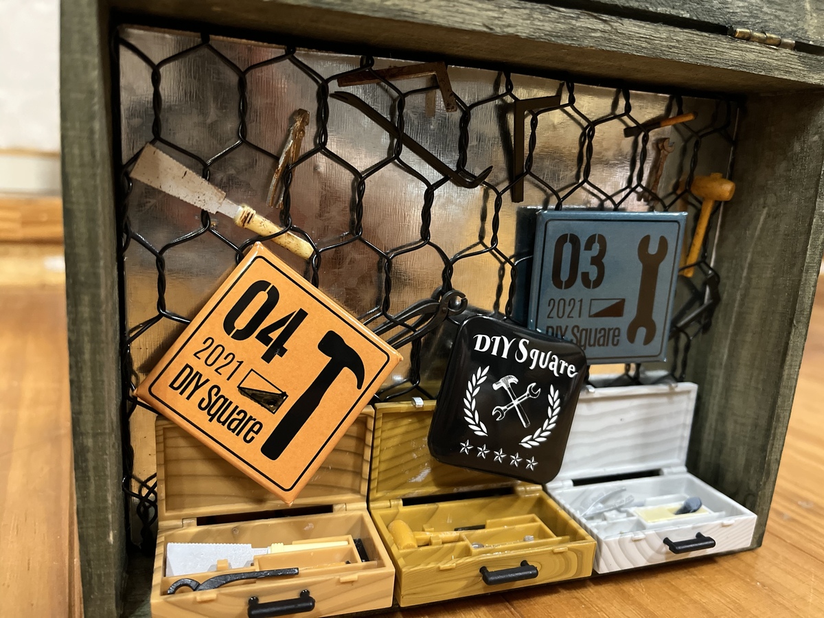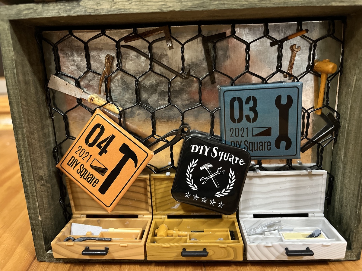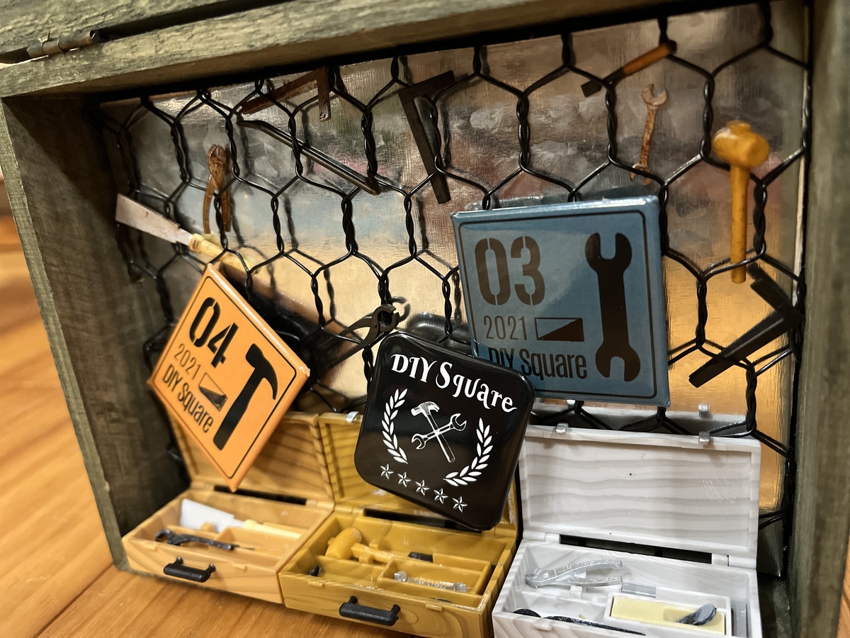 そこから、大量にゲットした大工道具ガチャのうち、前に瞬間接着剤で接着した1セットずつを箱の下に並べました。