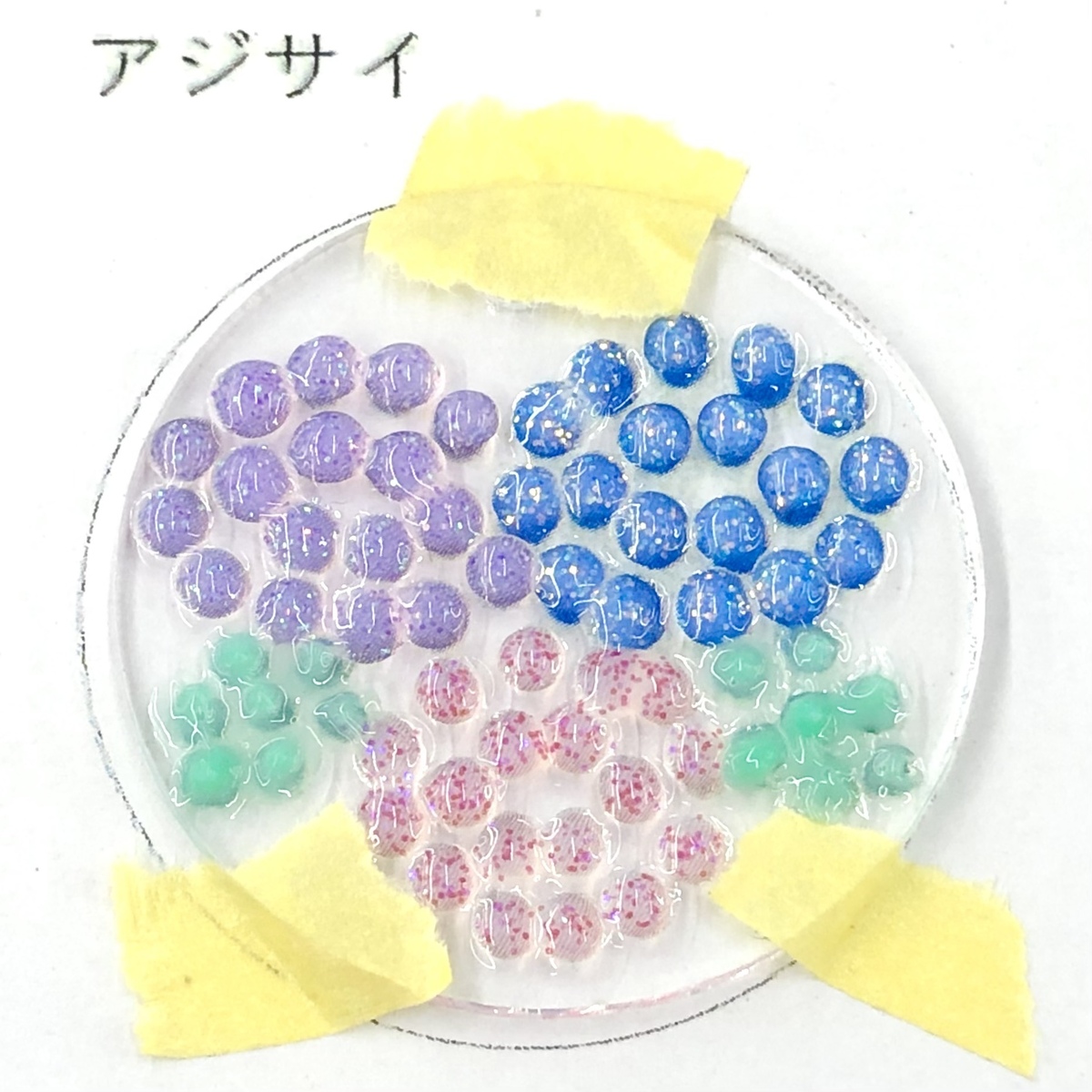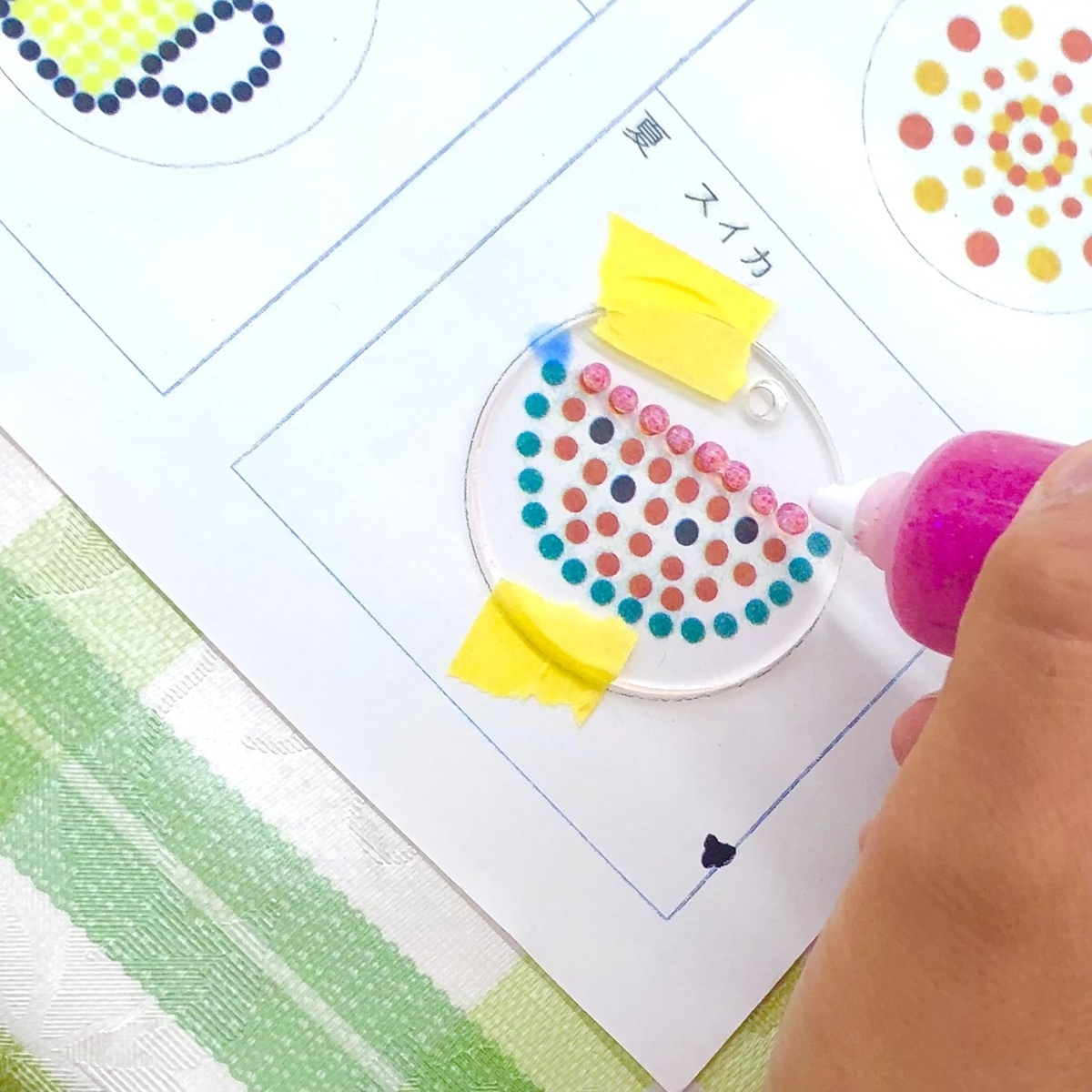 ![]() ① 硬い透明な板の下に、見本の図案を敷き、色とりどりのジェルを落としていきます。 |