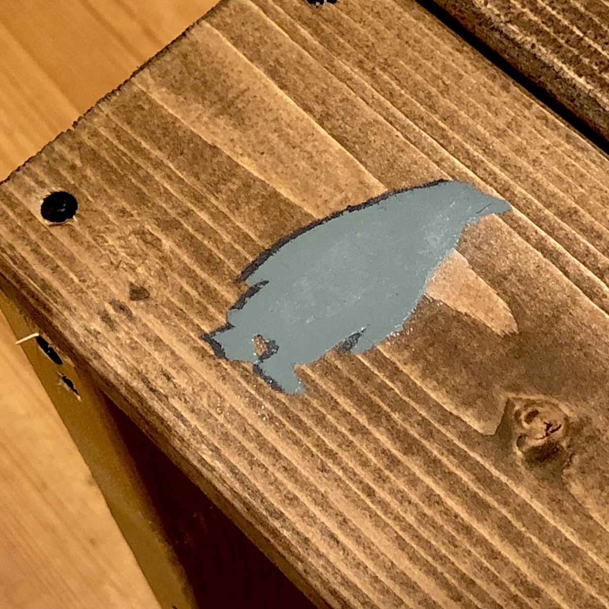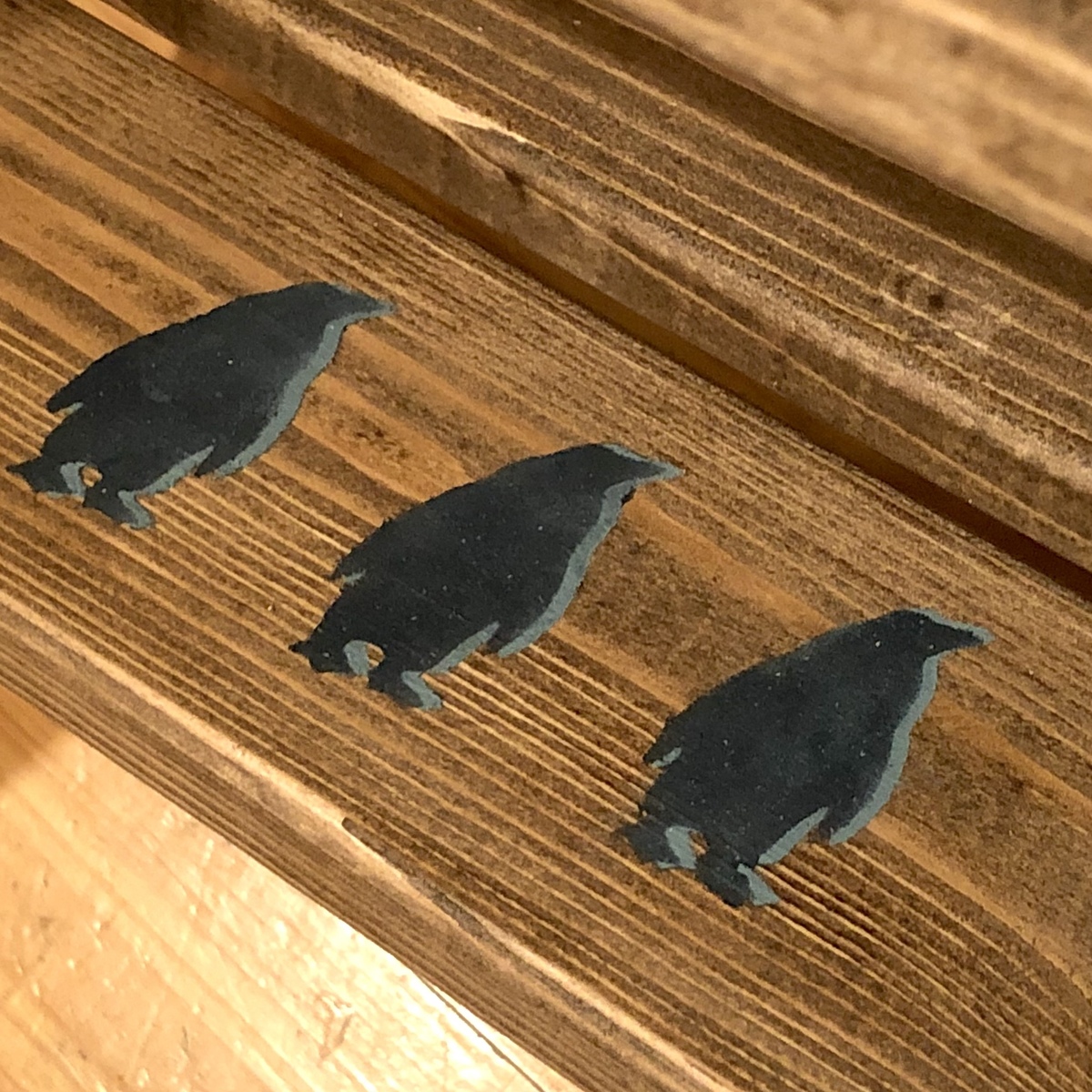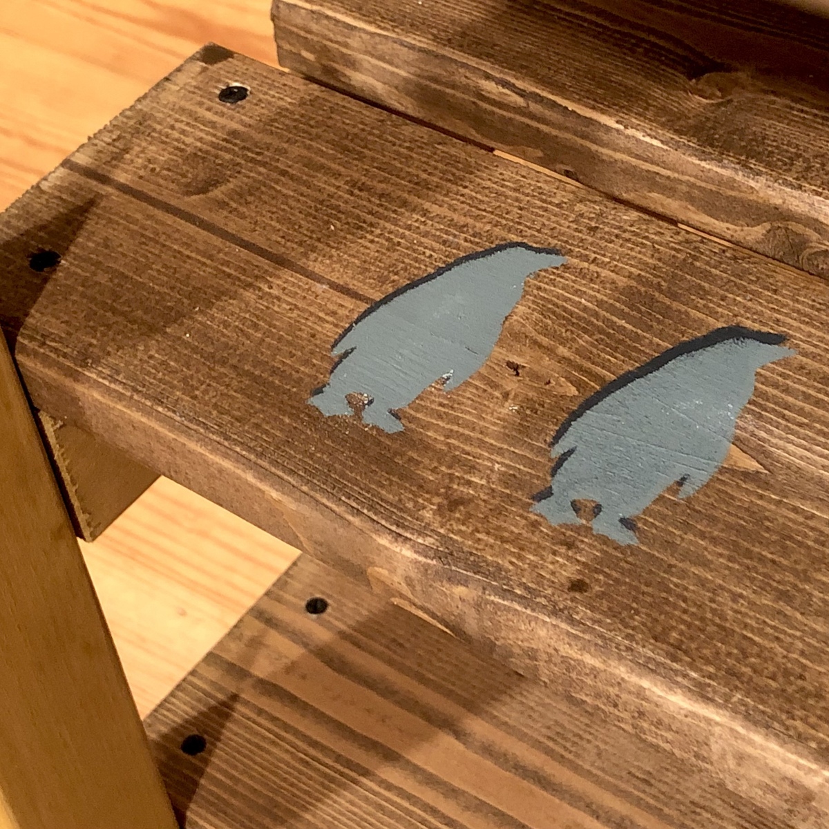 ステンシルは、子供が好きなペンギン🐧に決め、PLUSで二色を使い、上2段は前向き、一番下は後向きにアレンジしました。