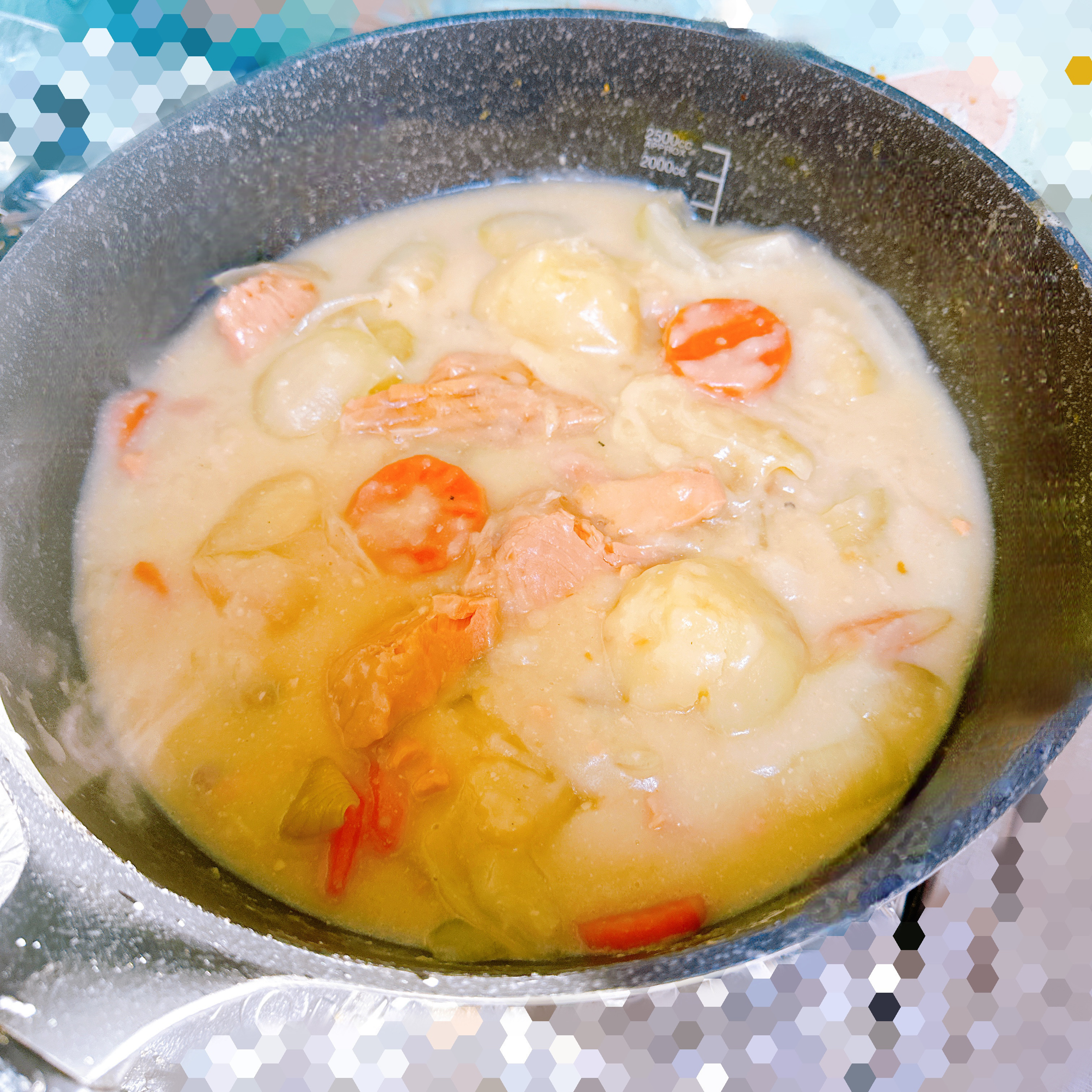 白いシチューにサーモンのピンク色が美味しそうです☺️