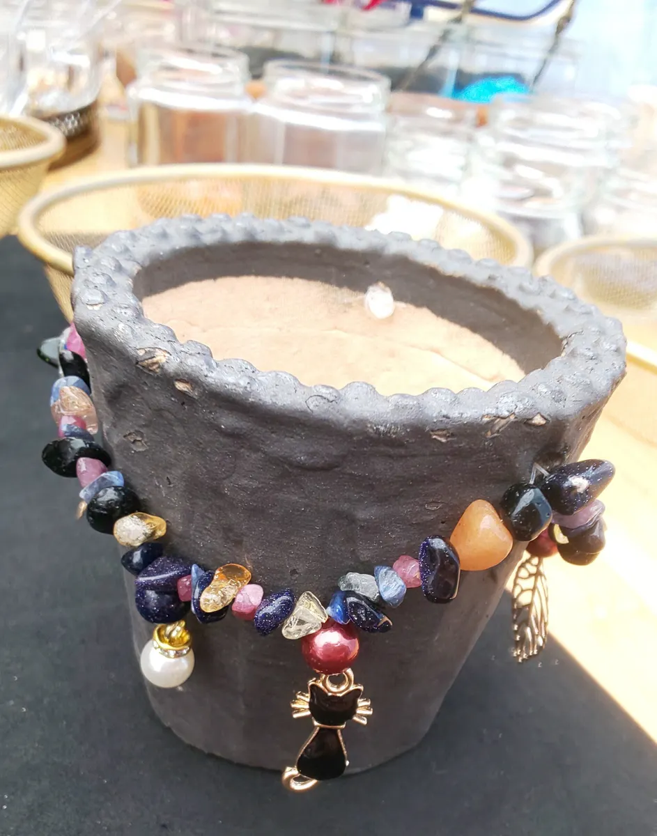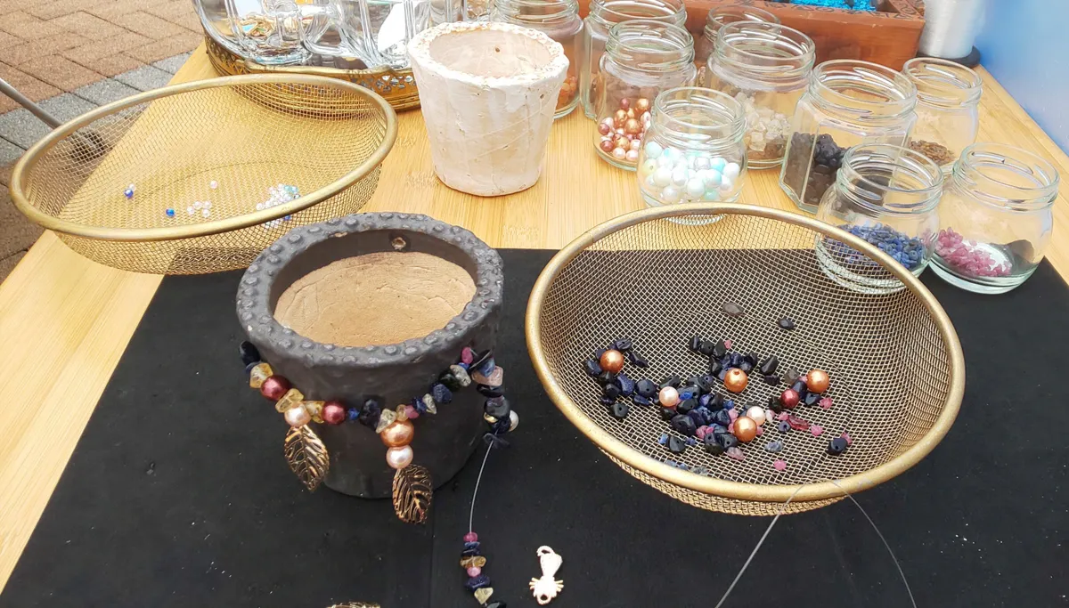 フラワーマーケットで多肉が欲しがる鉢を作っているpotsさんのところでビーズを付けて作るオリジナル鉢を作ってきました