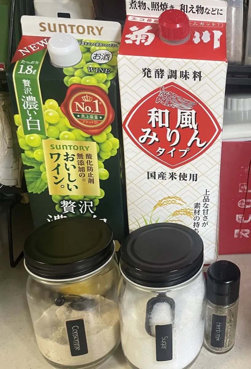 ①白ワイン・味醂・コンソメ・味の素・バジル