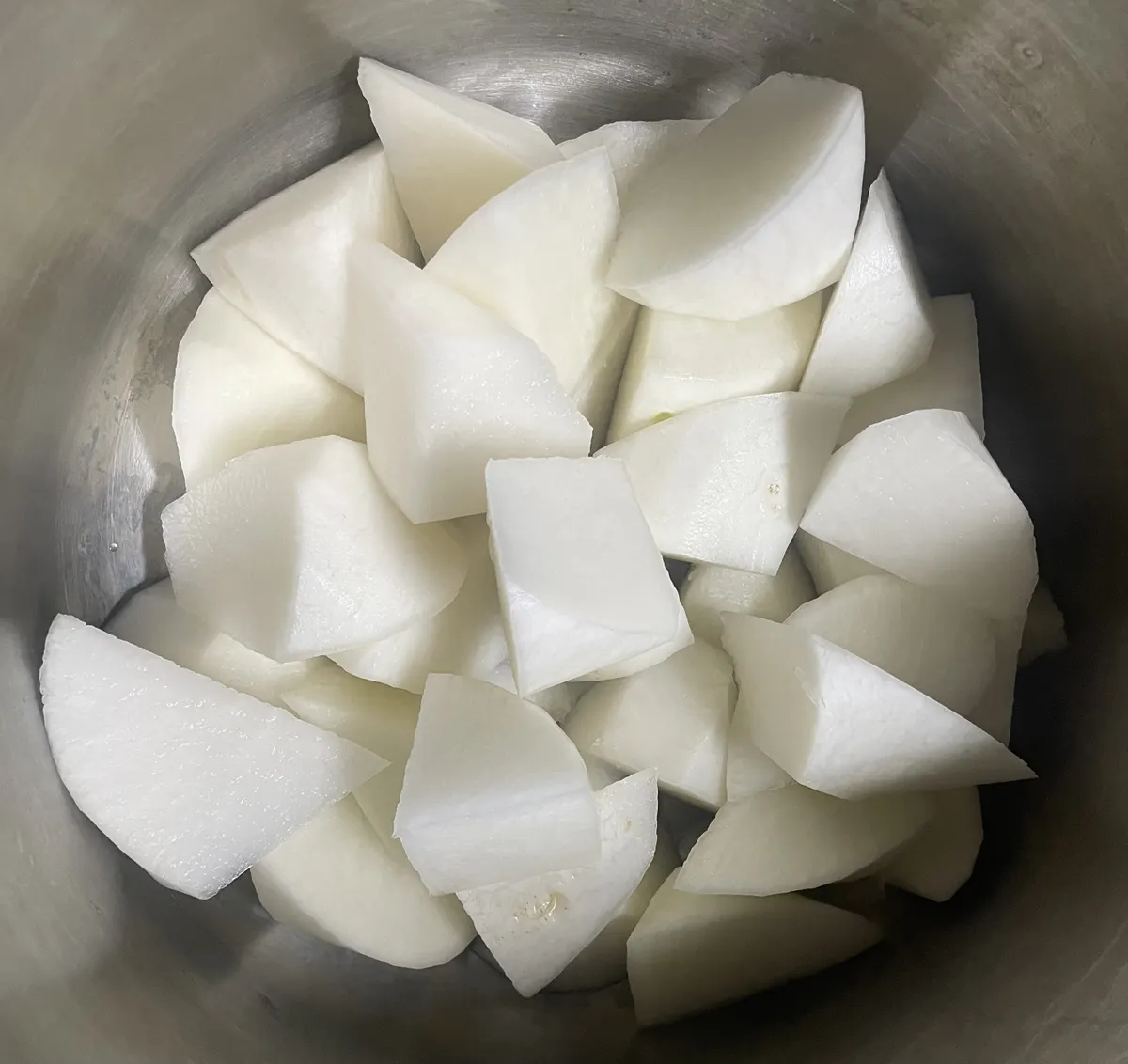 圧力鍋に大根の乱切り・ロールキャベツの順でダバぁ〜🤣🙌🤍🐖🥬➰🍲‼️💨✨
