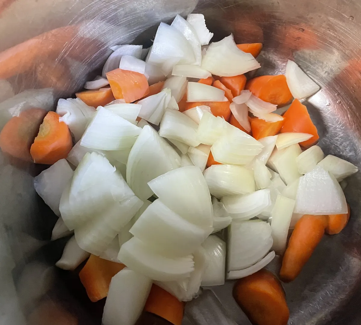 お隣に別途寸胴鍋用意した方には人参乱切り・玉葱適当カット放り込んどいてぇ〜🥕🧅🔪➰🍲✨