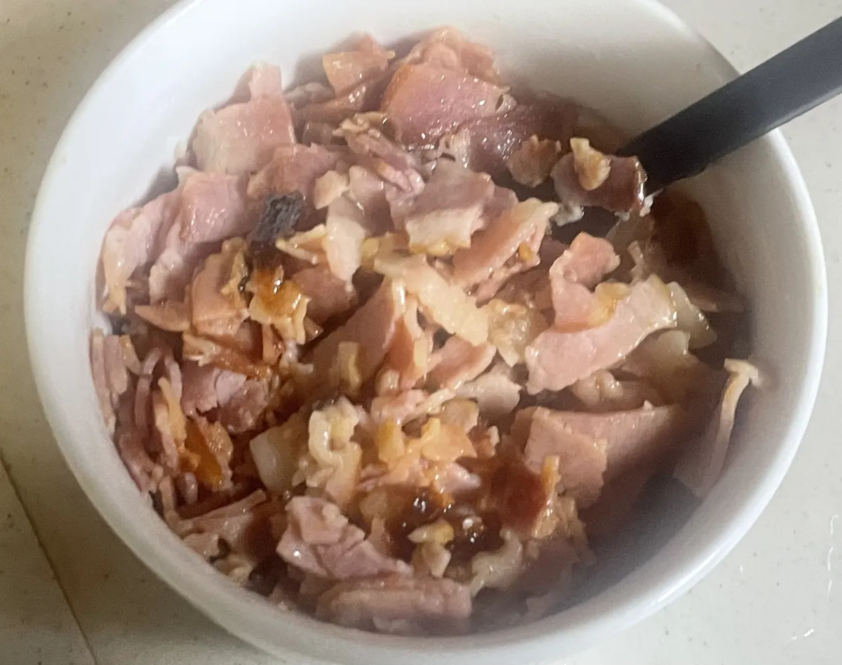 更にベーコンカットしたのを耐熱容器でチト焦げ目付くくらいまでレンチンしとこぉ〜😁👍🥓🔪➰🥣🗃️♨️✨