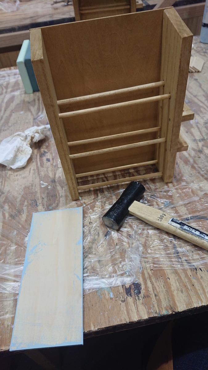 横棒をトンカチで叩いて横棒を嵌めます