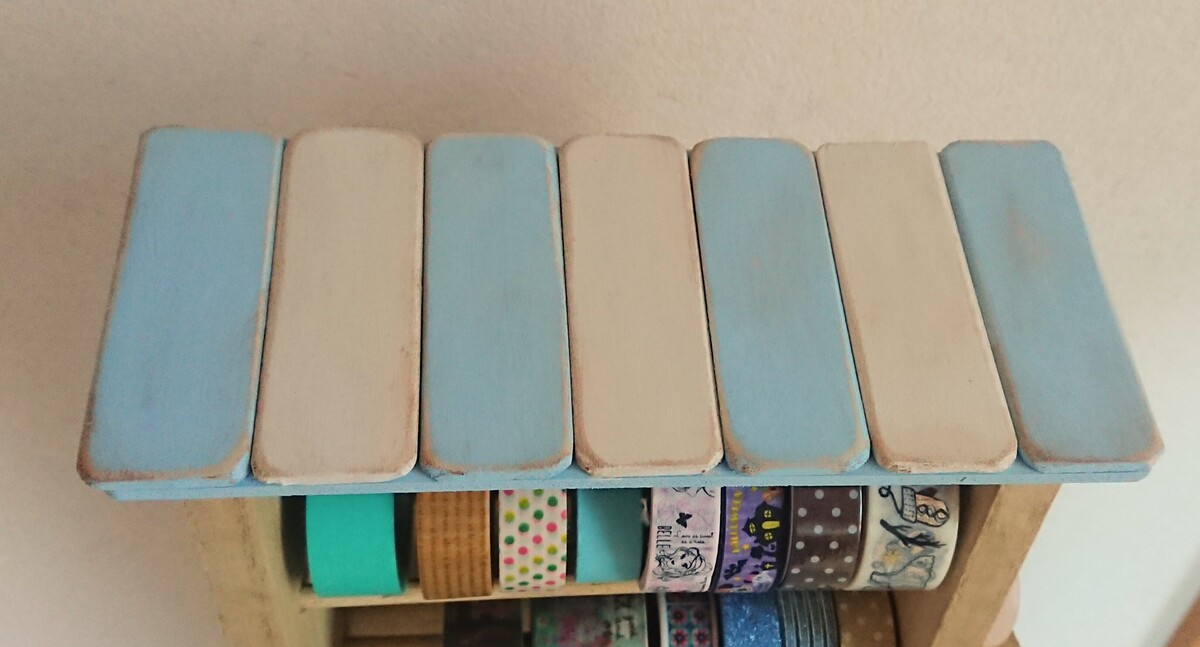 やすりをかけて、わずかに木の色味がチラッとみえる感じが素敵です✨マスキングテープを使わない時も、つい眺めたくなりますね🥰