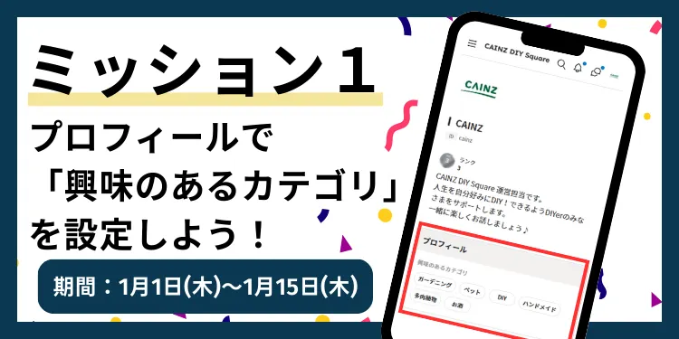 今回新年もCAINZ DIY Squareでの活動をもっと楽しんでいただくために、「ミッションポイントキャンペーン」をご用意いたしました✨