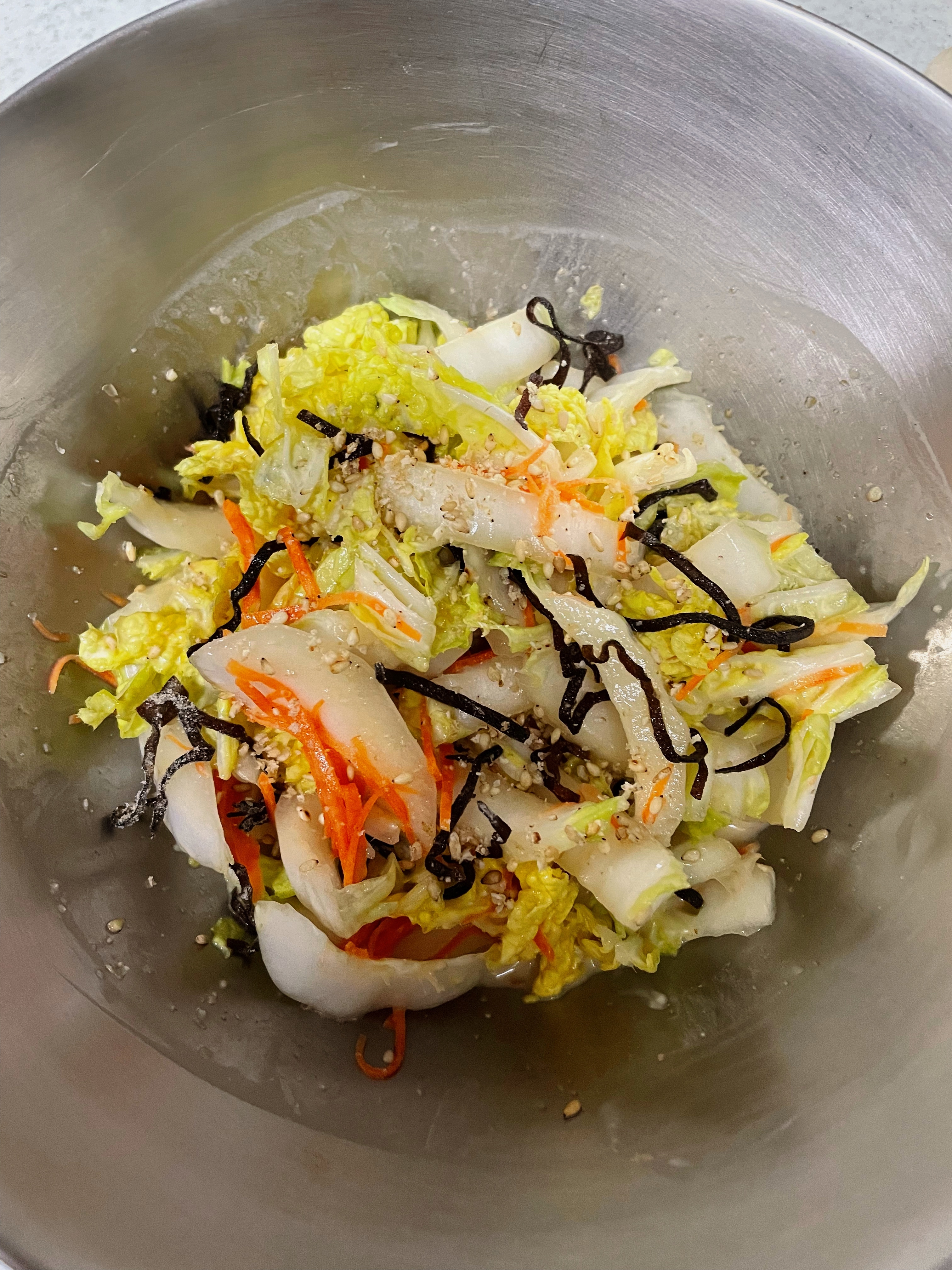 いつも白菜サラダというと胡麻ドレを和えているのが定番でしたが、麺つゆ&ポン酢&マヨネーズもあっさりしていて美味しい😆🎶