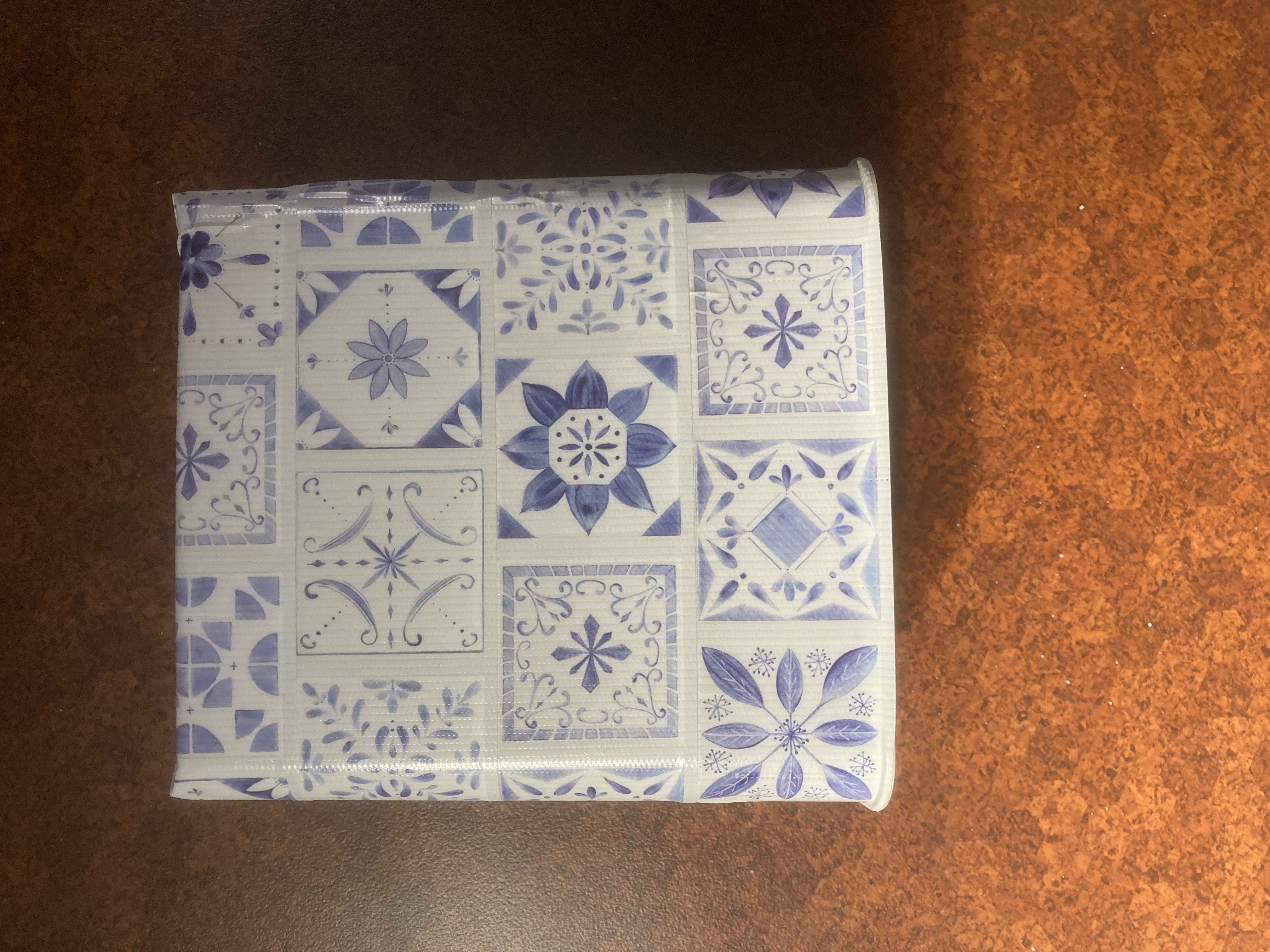 メモ帳入れのビフォーアフター、デザインマステでのリメイク、初めは陶器製かと、思いました😅すごく素敵ですね。ヾ(๑╹◡╹)ノ"