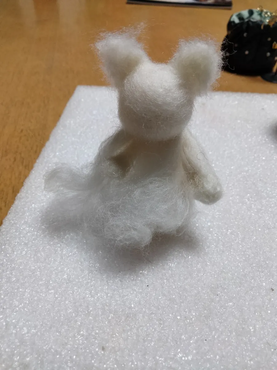羊毛フェルトで猫ちゃんベース作ってふわふわ植毛用羊毛フェルトの白まで完成…これから黄色や茶色や黒といろんな色を加えて三毛猫ちゃんに成ります😾