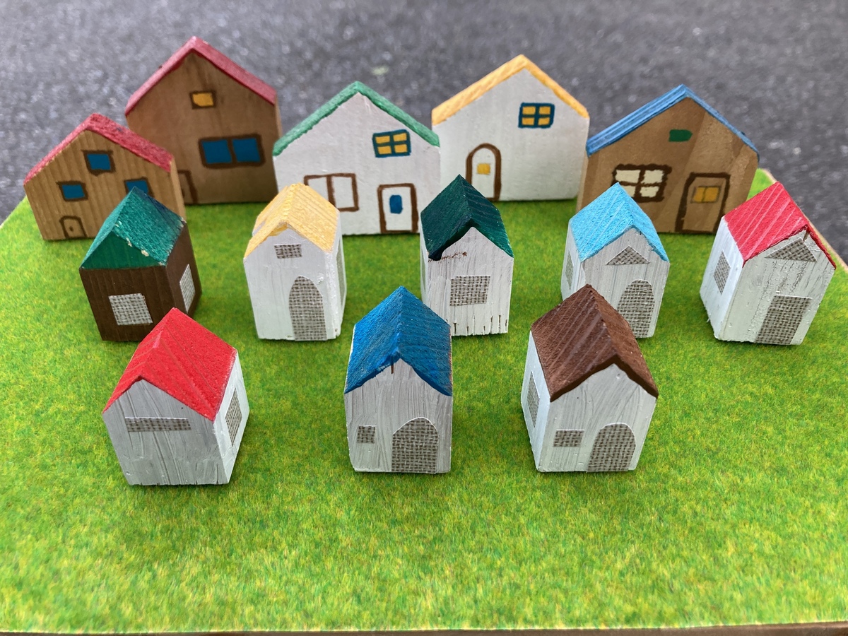 先ず2.4㎝の正方形の杉材を長さ4㎝(高さ)に卓上ノコギリで切断、屋根部分は45度に切断し、在庫の水性ペイントで四角面、屋根を分けて色塗り乾燥後、四角面に額縁で余りのリメイクシールを玄関ドア🚪と窓の感じに雑に貼りました^_^