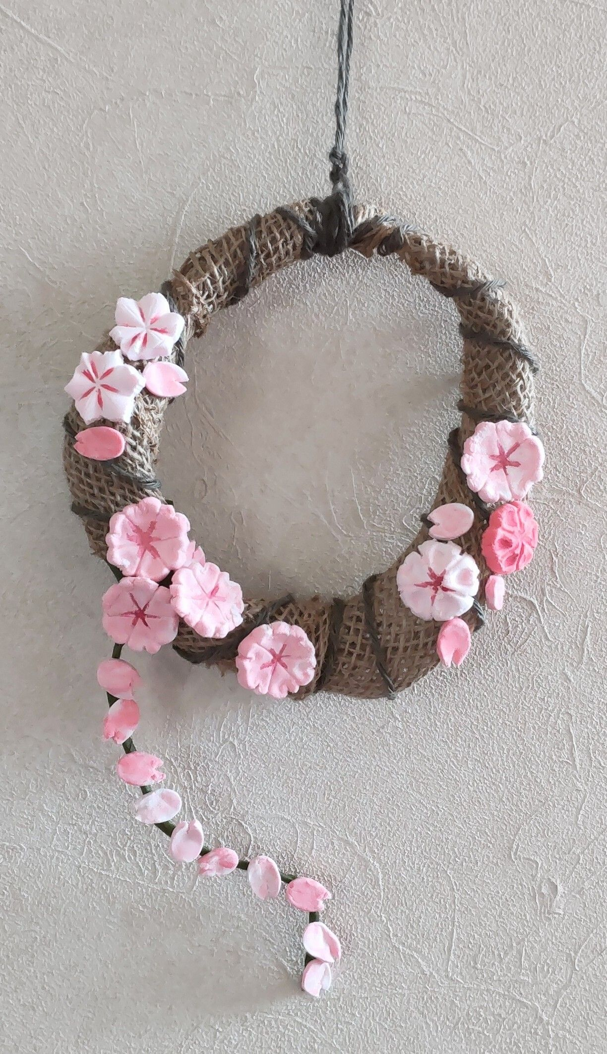 シダーローズさんが DIYレシピに載せてくれた 紙粘土で作るさくらのリースを 真似っこで 作ってみました☺️