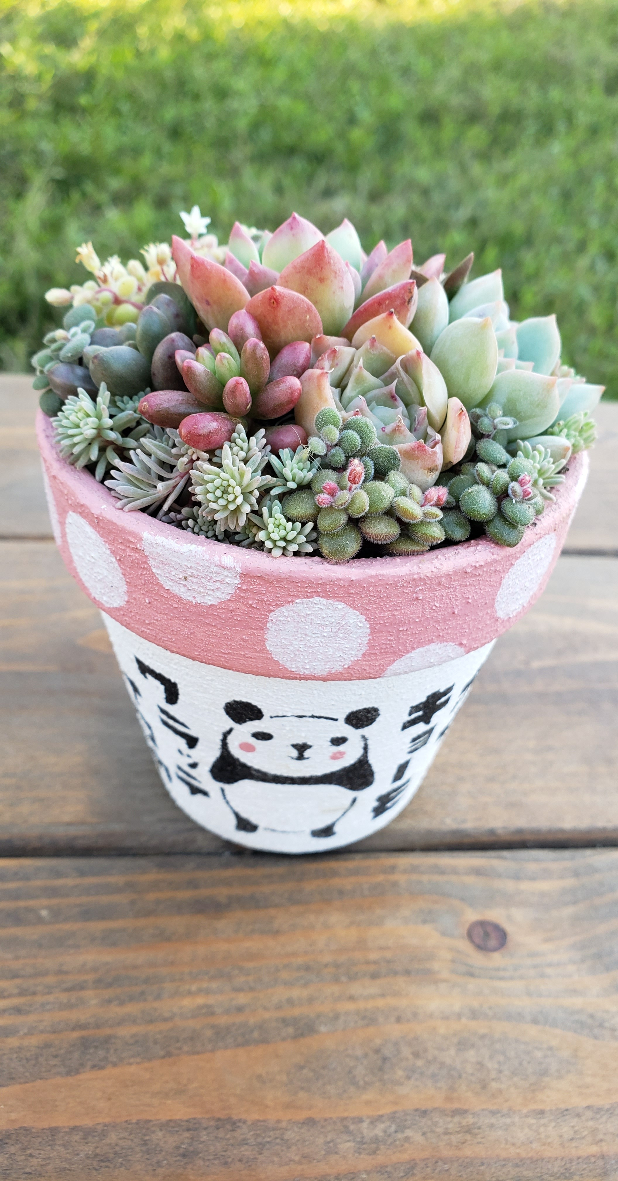 投稿を表示水玉模様の可愛いぱんだ鉢にもりもり多肉さんたち🎶