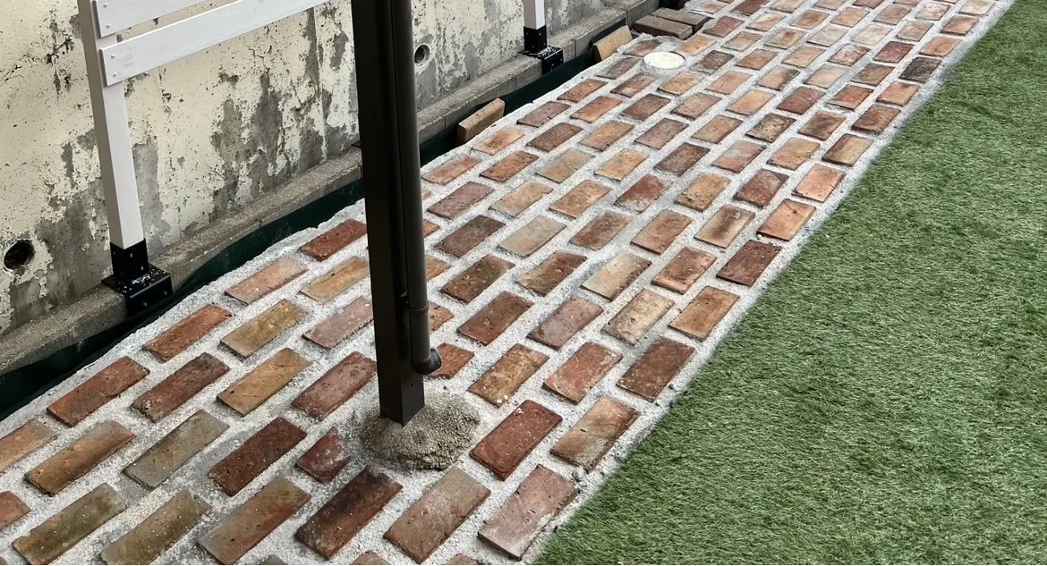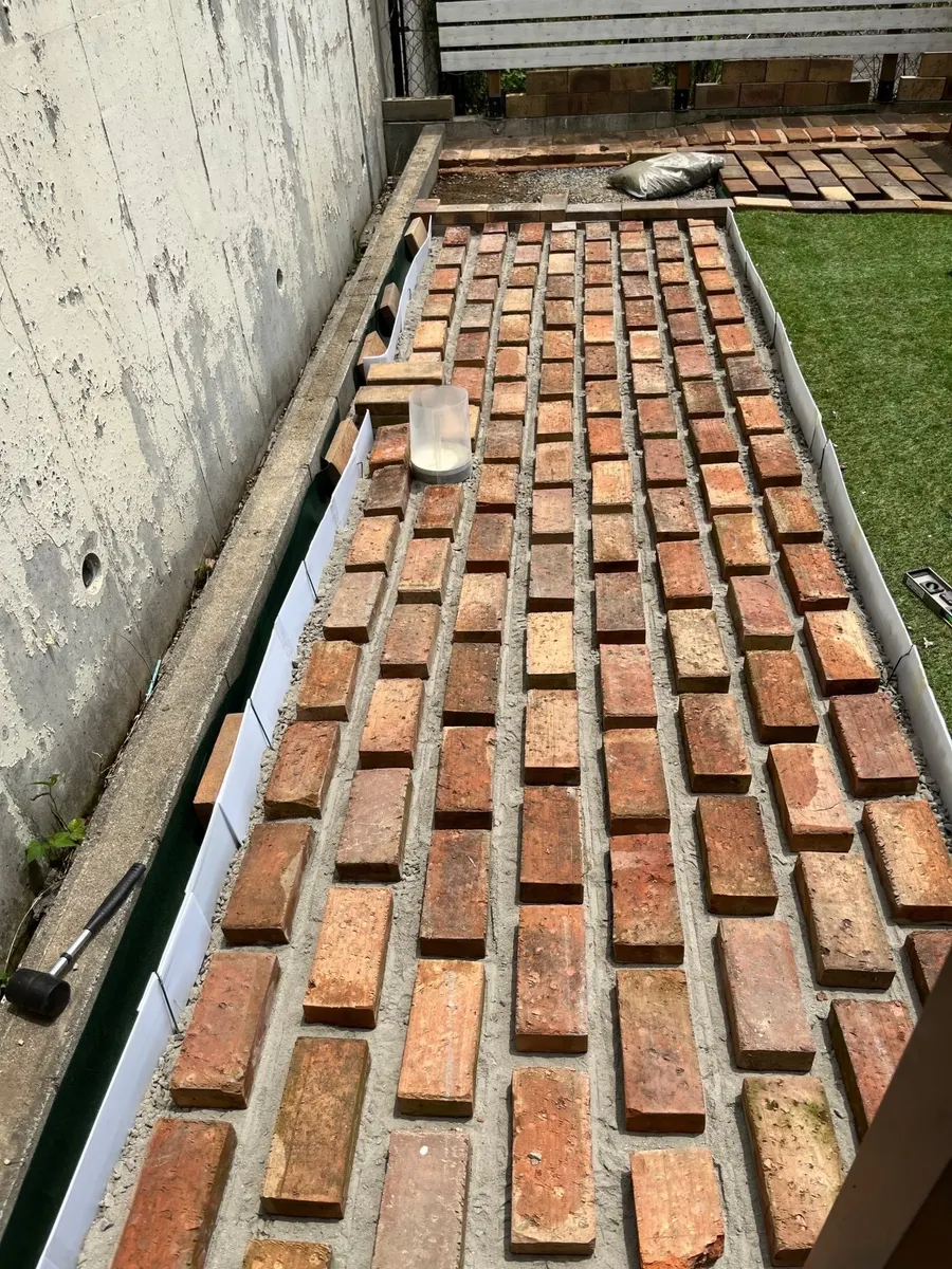 スキマにインスタントモルタルを粉のまま埋めて箒でならして、最後にシャワーでしっかりとお水をかけて一晩置いて固めるだけのレンガ敷きですが、これがめっちゃ良かったのでオススメです❣️家でモルタルこねこねってなかなかに大変なので💦