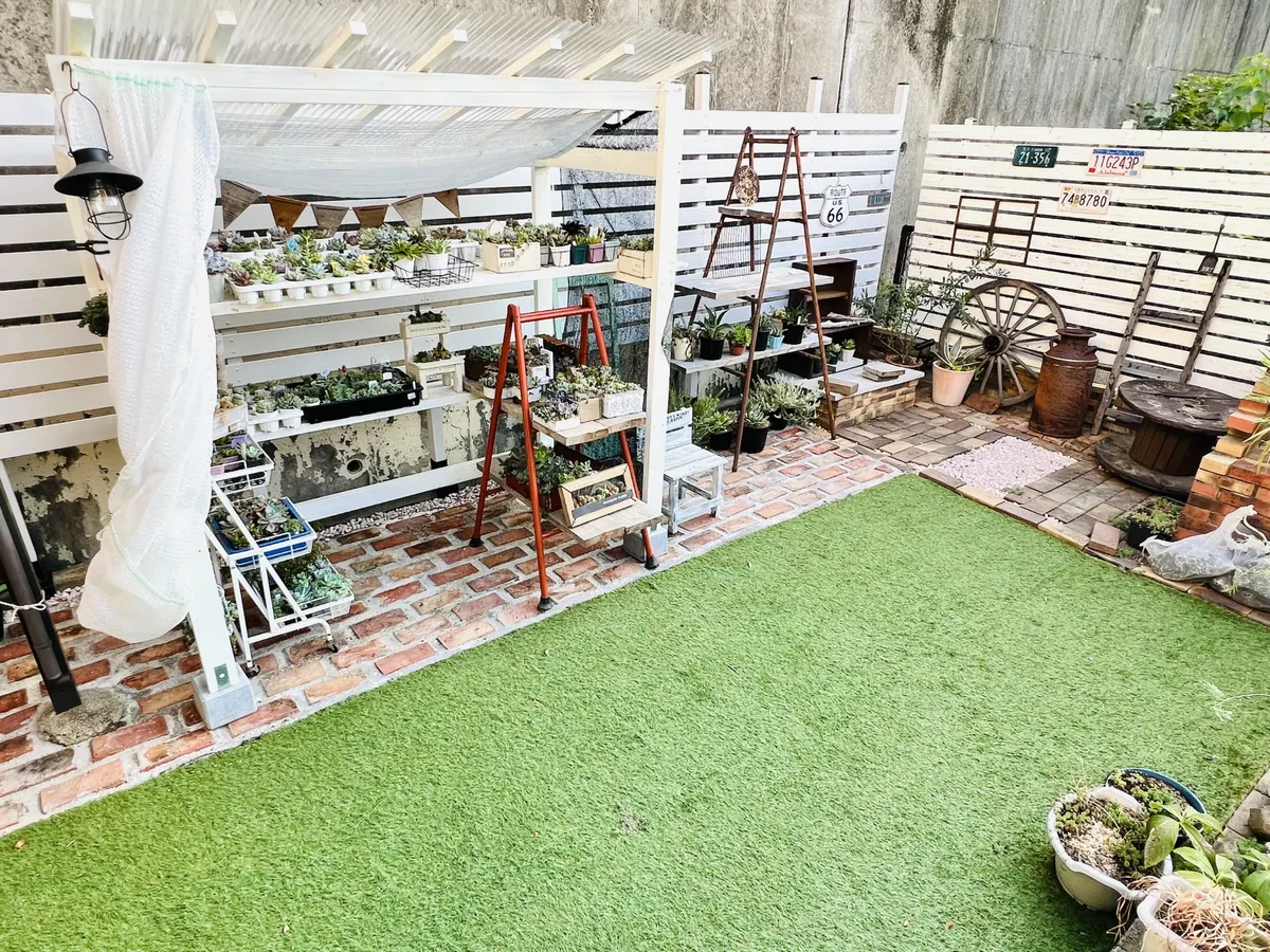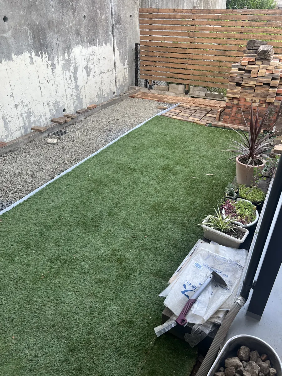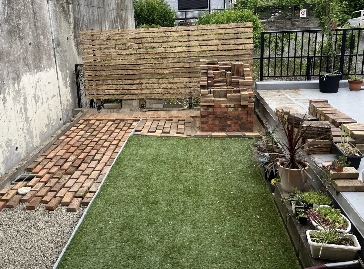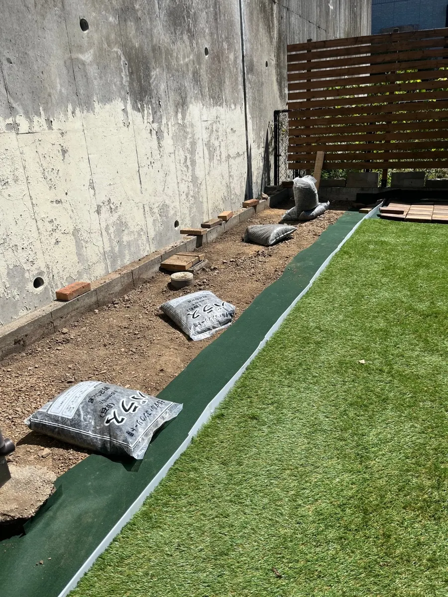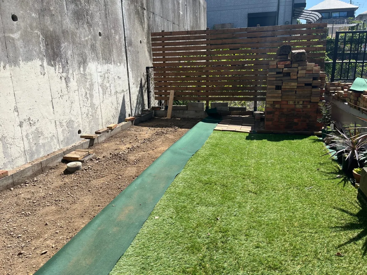 私も自分で芝を貼り、枕木調のブロックを敷いてってやってる。