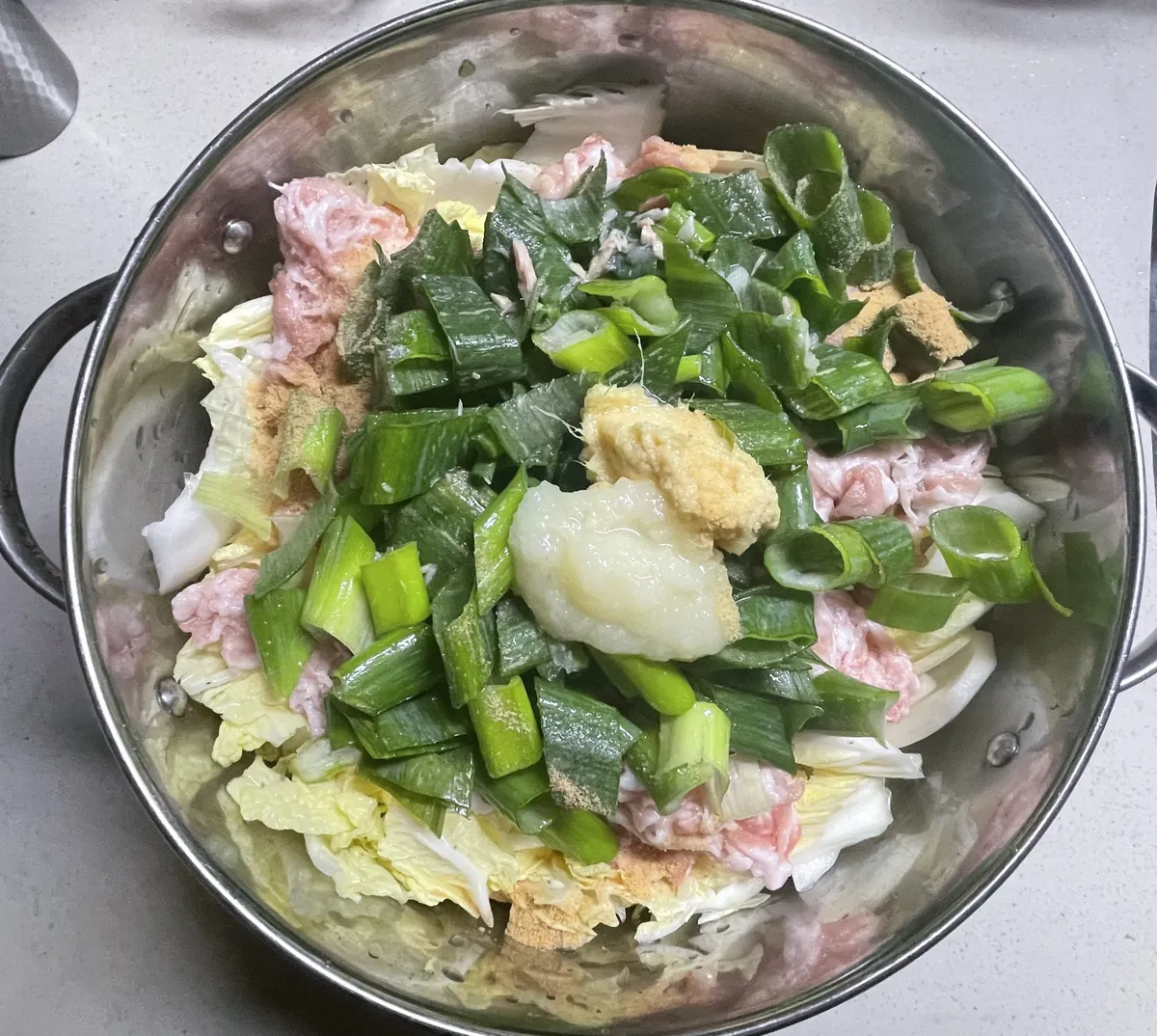 鍋に白菜・豚バラ肉・葱青身の順でドカーンとブチ込んだら、片栗粉・ポン酢以外の調味料も投入〜😆🙌🥬🐖🍶➰🍲💥‼️💨