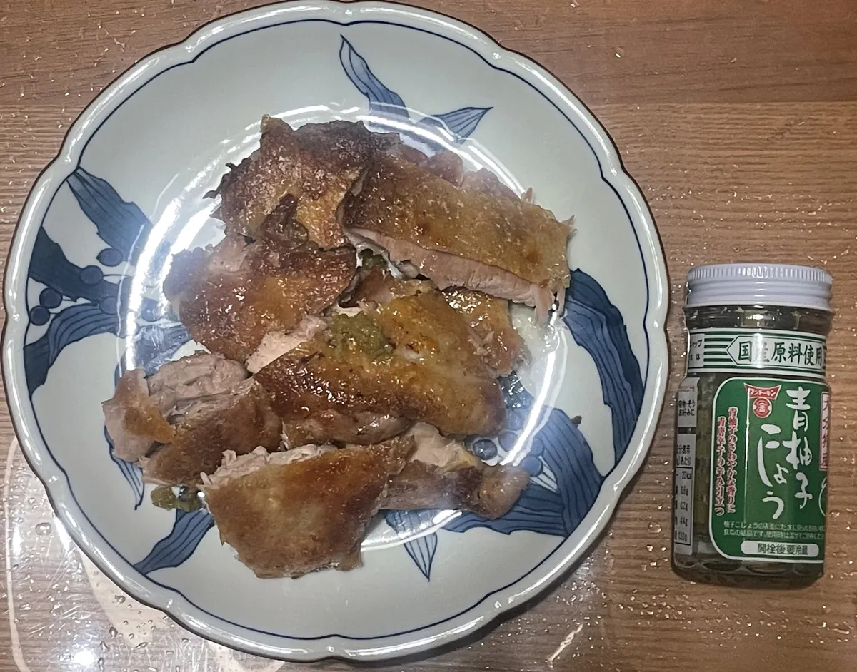 鳥もも肉の皮パリパリ焼きに柚子胡椒乗せ、すごくそそられる料理🐔