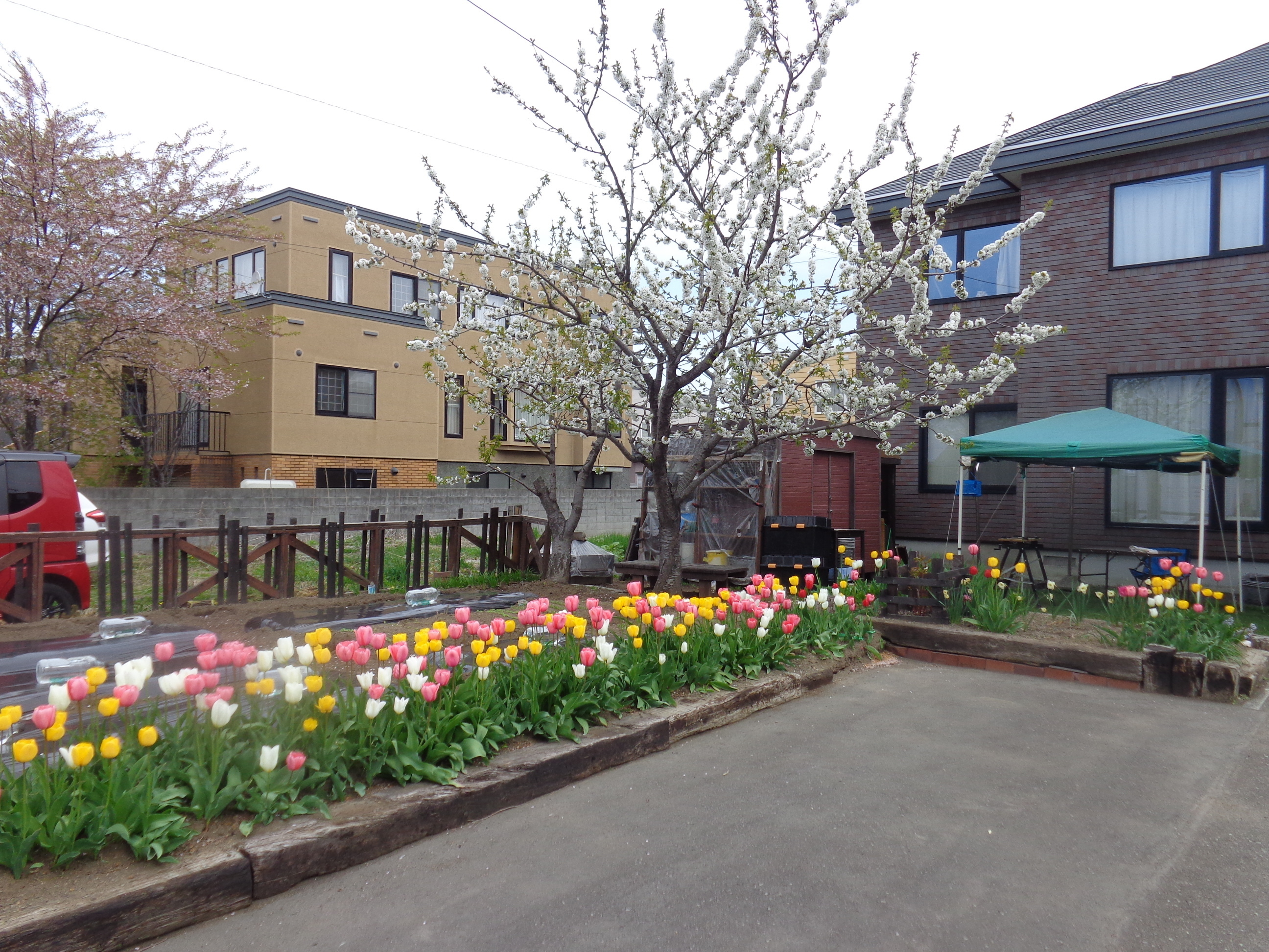 素敵なお庭ですね。チューリップが咲いているところは、もしかしてついこの間、雪掻きしていたところですか?