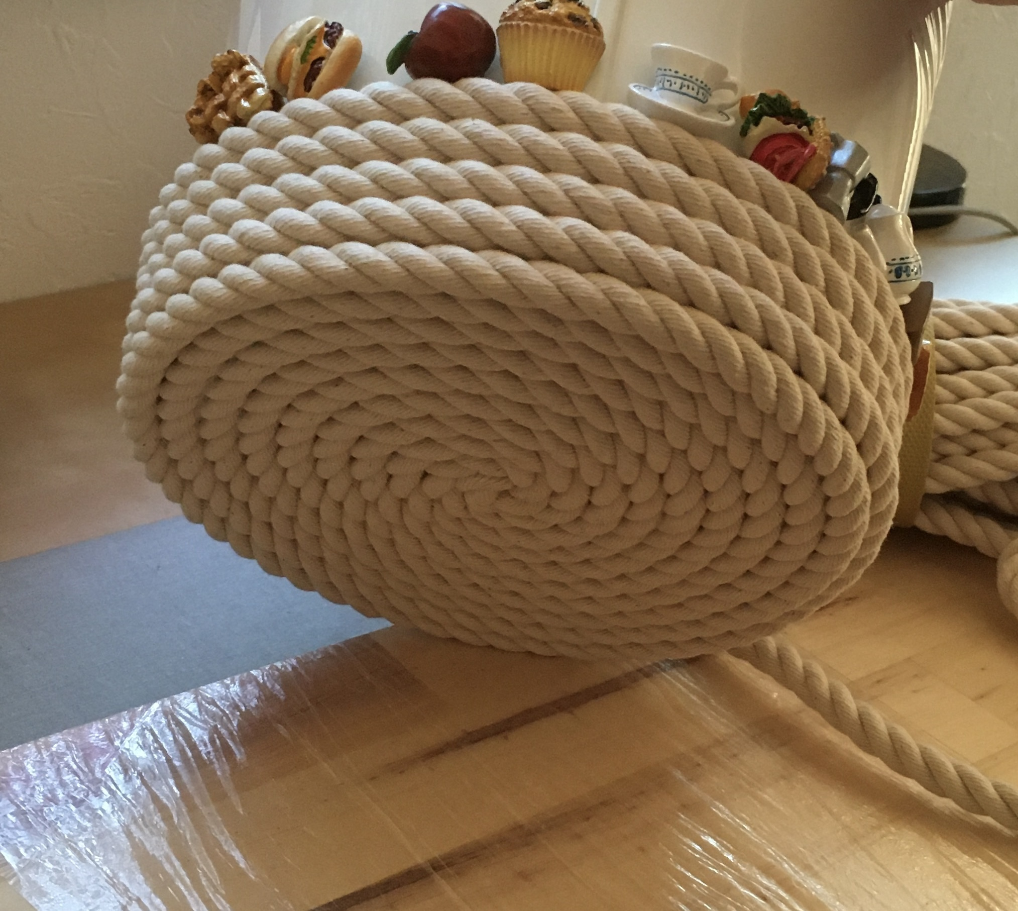 トップ > DIY > インテリア > スリッパ入れ・その2(制作途中) 退会したユーザー 2024/08/08 23:29 スリッパ入れ・その2(制作途中) しげちゃん しげちゃんさんからご質問のあった、底からの画像です。 せっかくなので、制作途中のときに撮影したものを投稿します。 中心から始めて円を大きくしていき、型の縁に沿って高さ方向に進んでいきました。 最初の方はけっこう力づくで巻いたので、ロープの先端がほつれ、結果、出来上がったものを内側から見ると底の中央に毛が生えたような感じになっています。 ちなみに、仕上がりサイズは最大直径約20cm×最大高さ約22cmのゆるいテーパー形状で、使った綿ロープはφ9mmの20mで十分足りました。 いいね 共有する 共有する X LINE リンクをコピー コメントする 1 件の返信 (新着順) ミュートしたユーザーの投稿です。 投稿を表示 どり 2024/08/09 06:19 わーっ♡ 出来上がり投稿からとんできましたが、底もとても綺麗な仕上がりですね!しっかり目に巻くのもポイントですね^ ^具体的なサイズや材料、ありがたいです。 いいね 返信する ミュートしたユーザーの投稿です。 投稿を表示 退会したユーザー 2024/08/09 09:22 どり コメントありがとうございます。 サイズ、参考にしていただければと思います。 あと付け加えで、底の部分は、目当ての直径の大きさに近づくまでは、ラップを巻きつけた作業台の上で、型は使わずに制作物を手で台に押し付けながら巻いていきました。 いいね 返信する ミュートしたユーザーの投稿です。 投稿を表示 どり 2024/08/10 23:41 退会したユーザー なるほど! そのほうが力が入れられますね✨参考になります☺️ありがとうございます。 いいね 返信する