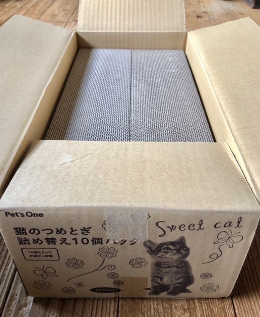 いつも買ってる100均の段ボール製猫の爪研ぎが厚みが半分になっててびっくりした😱