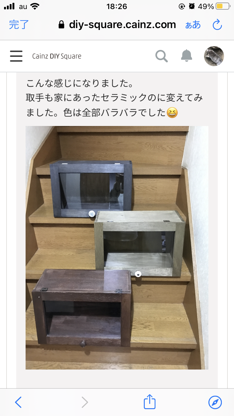 投稿を表示どれも落ち着いた色で素敵です☺️個人的には真ん中の作品が一番好みです😍今度作る予定で、色や取手をどうしようか考えていたのでとても参考になりました😊