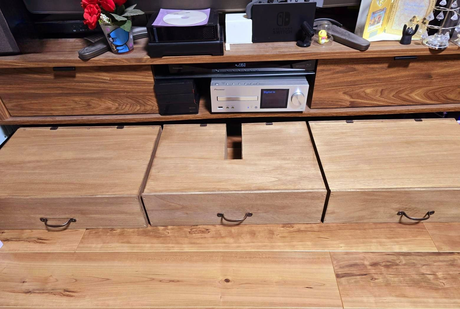 トップ > DIYアワード2025 > キャンペーン > テレビ台下収納☆ ENA 2025/10/03 02:04 テレビ台下収納☆ ■作品内容 テレビ台下に隙間があって勿体ないので収納を作りました! ■こだわりポイント カインズでベニヤや桐板を購入して作りました。取っ手は100均。 テレビ台の色とウォルナット(カインズで購入:木部保護塗料)が良い感じに馴染みました(*´ω`*) 3つ同じサイズで作ったら、まさかの真ん中にもテレビ台の支柱があって真ん中の箱が入らず(大笑)、急遽切り込みを入れる構造に作り直しましたwww ゲームソフトやDVD等が収納してあります。便利(*´ω`*) 木工DIY部門【DIYアワード2025】 くらしに、ららら。部門【DIYアワード2025】 テレビ台下 いいね 共有する 共有する X LINE リンクをコピー コメントする 0 件の返信 (新着順)