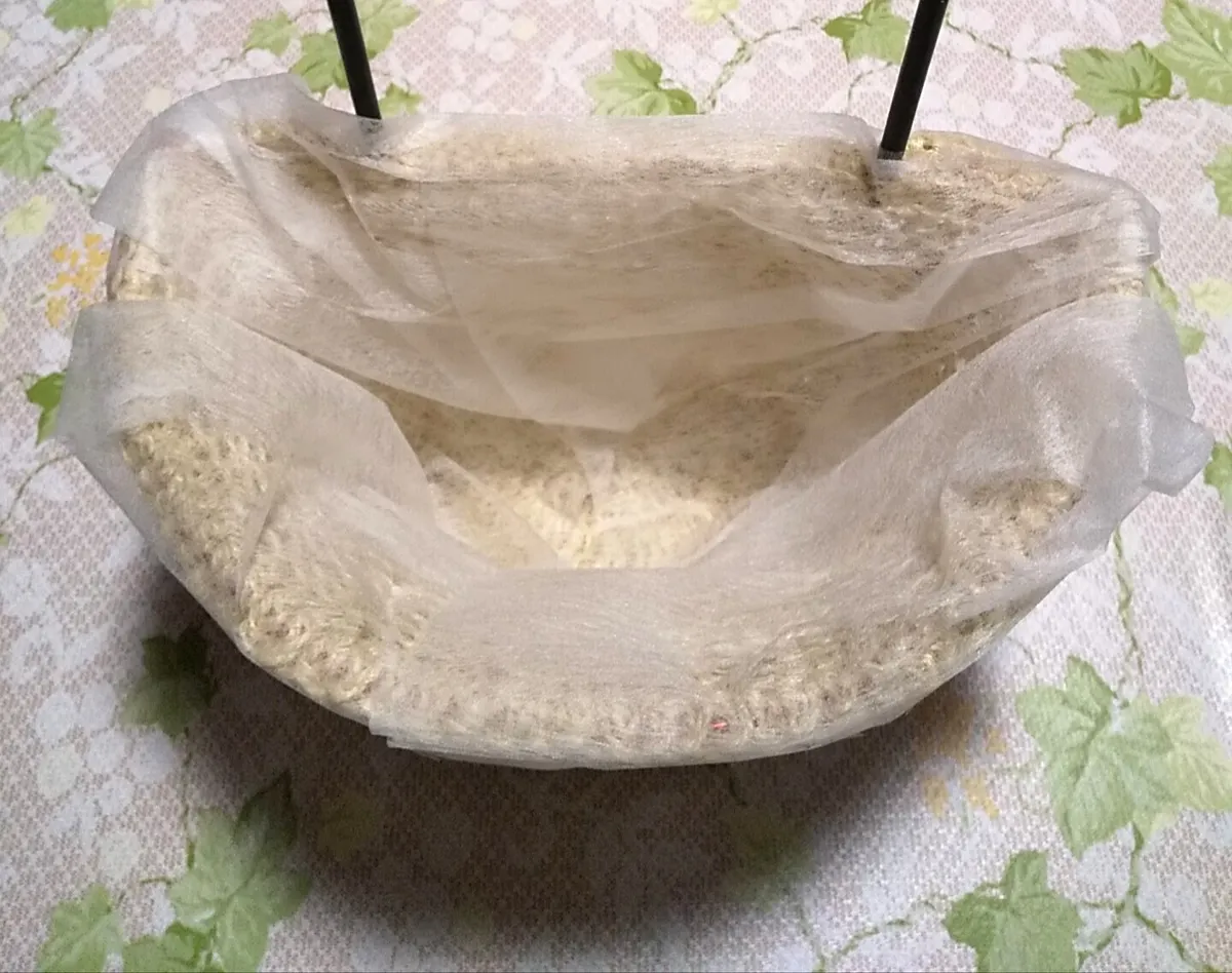 ・ハンギングバスケット…ジュートヤーンで手編みしたマットに、生ゴミ用不織布 3枚をカットし、全体を覆う様に、また 中央に1枚敷いた物
