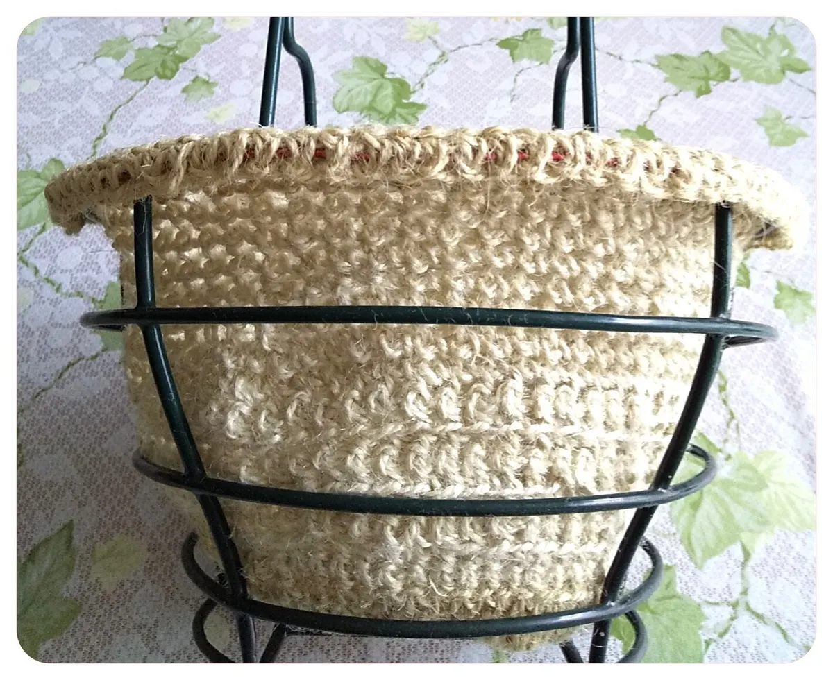 ・お花用のハンギングバスケットですが、火祭りが徒長し、下へ垂れ下がる時にも対応出来るのと、形が可愛らしいので、マットをジュートヤーンで編み、寄せ植えしてみました。