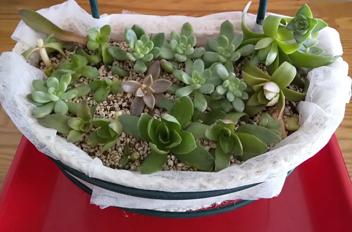①ハンギングバスケットに底石2つ、再生土と多肉用土を同量、マグァンプDを入れる。