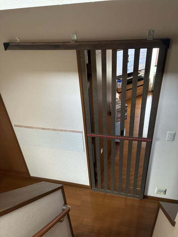 最初はドア枠にはめ込む形で使っていたが毎回重いので、床ににレールっぽくなるプラスチックの板を貼り、柵の下に一方通行のコロコロ?を3箇所付けて、ドアの上部分に柵が干渉しないようにL字金具で板を取り付けた。