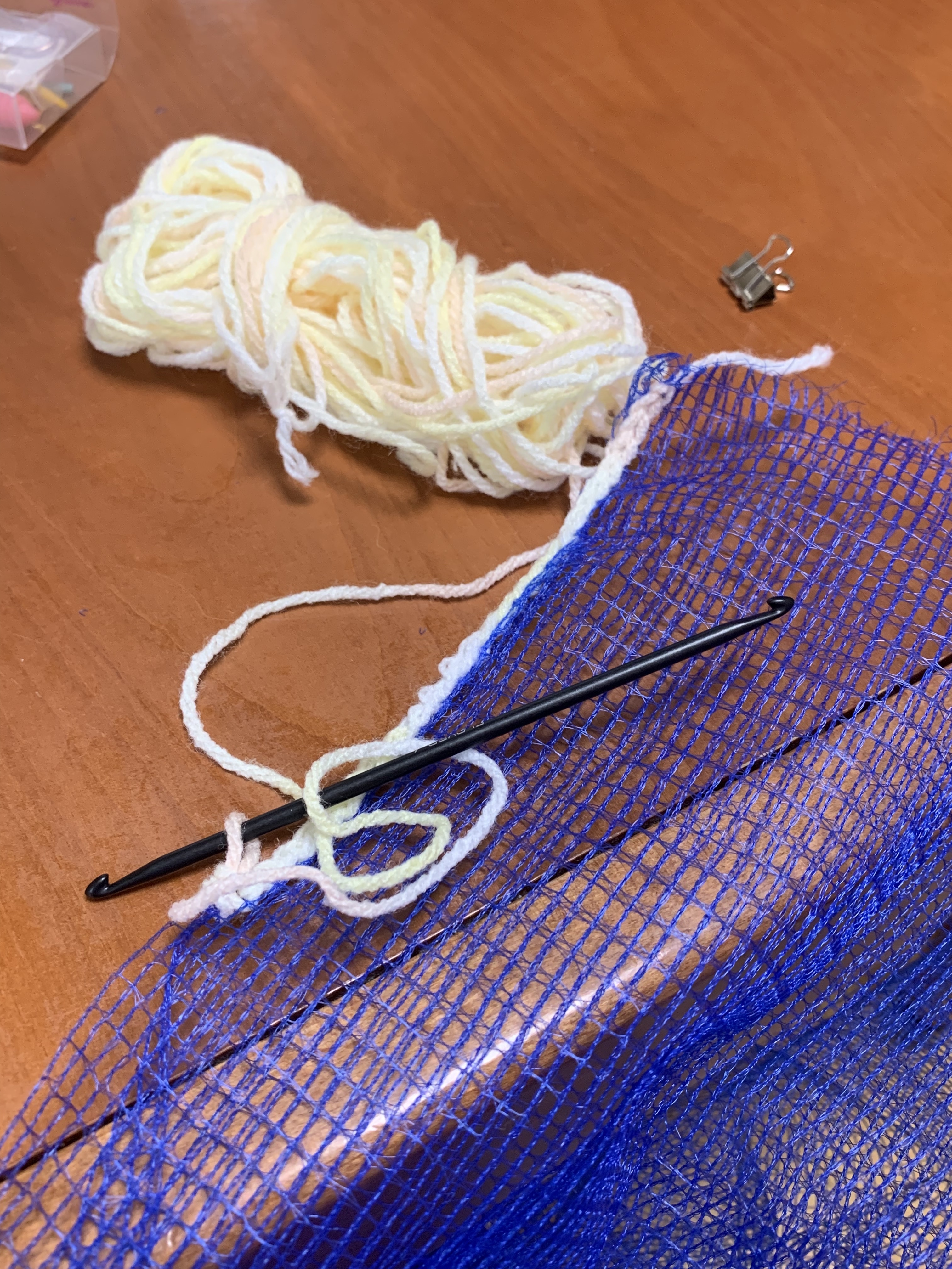 2枚をアクリル毛糸を使ってはぎ合わせていきま〜す。