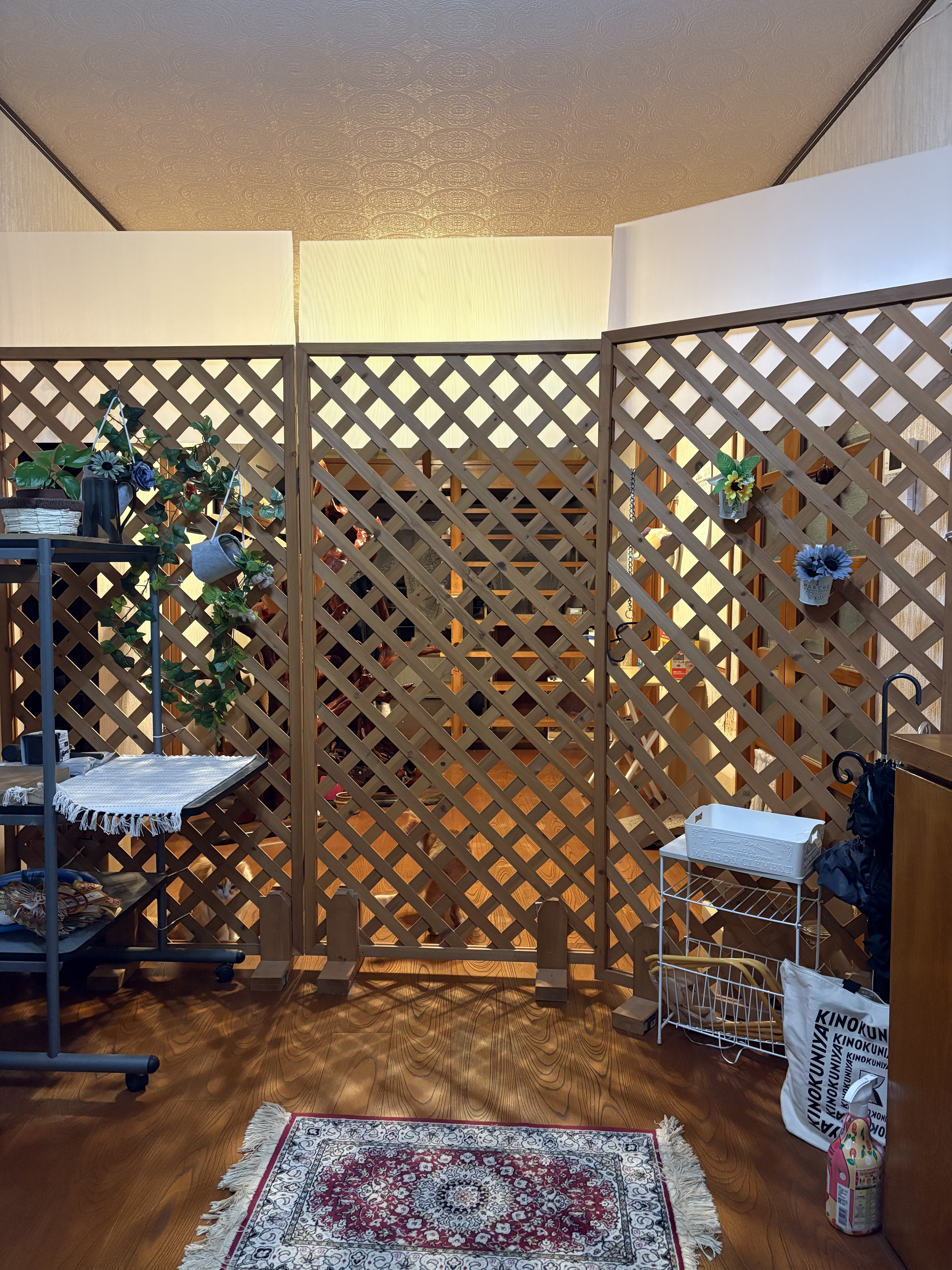 カインズさんのラティスを3枚組み合わせ、蝶番をつけ、ラティススタンドの裏には傷防止用のフェルトを貼り、開閉もスムーズにできるようにしました。このままでは絶対猫たちがクライミングチャレンジするので、ラティスの室内側の上部にプラダンボールを鋲で設置して、上部からの乗り越えを阻止。