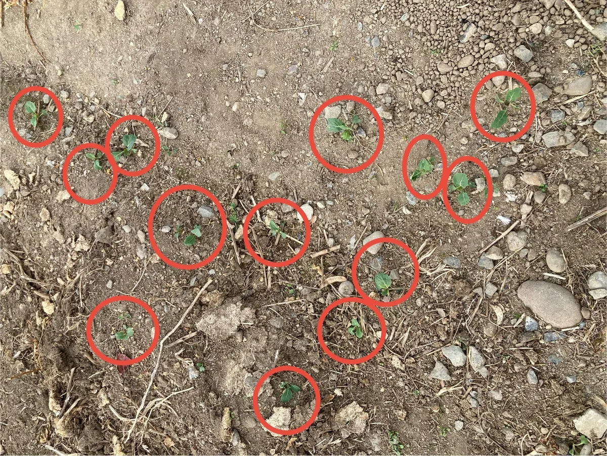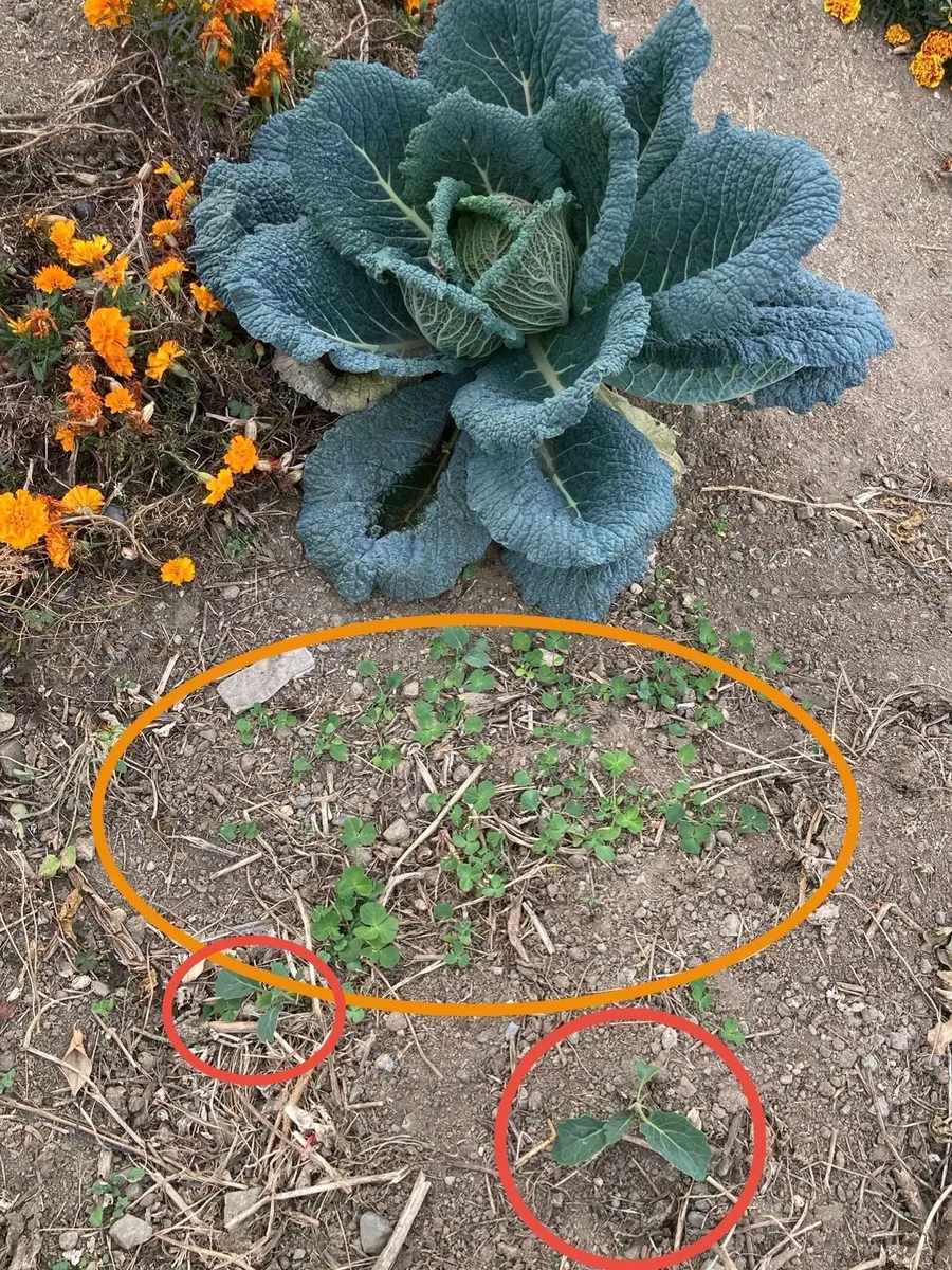 こぼれ種からたくさんの発芽、収穫するまで大きく育つといいですね😊