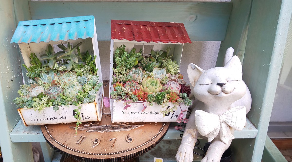 多肉ちゃんの寄せ植え、ふたつ色違いで並ぶと素敵ですね。💕